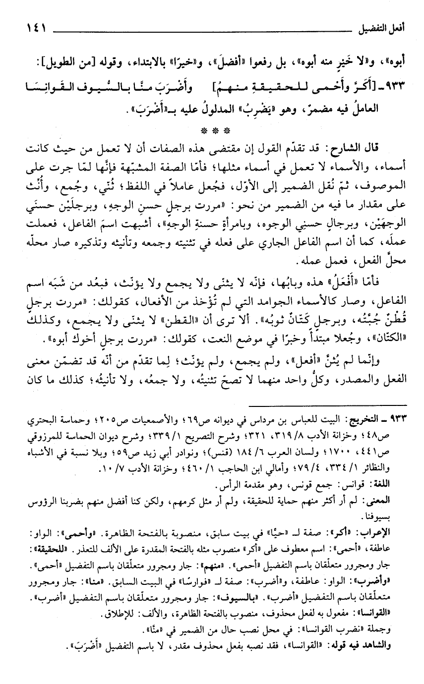 933 - التخريج: البيت للعباس بن مرداس في ديوانه ص 69؛ والأصمعيات ص 205؛ وحماسة البحتري ص 48؛ وخزانة الأدب 8/ 319، 321؛ وشرح التصريح 1/ 339؛ وشرح ديوان الحماسة للمرزوقي ص 441، 1700؛ ولسان العرب 6/ 184 (قنس)؛ ونوادر أبي زيد ص 59؛ وبلا نسبة في الأشباه والنظائر 1/ 334، 4/ 79؛ وأمالي ابن الحاجب 1/ 460؛ وخزانة الأدب 7/ 10.