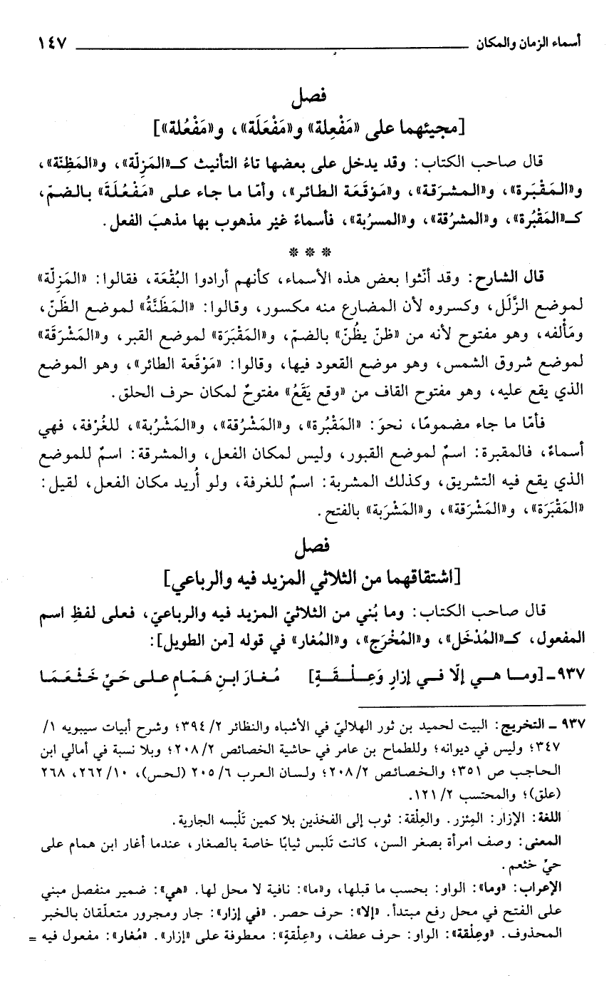 قال الشارح: وقد أنّثوا بعض هذه الأسماء، كأنهم أرادوا البُقْعَة، فقالوا: "المَزِلّة" لموضع الزَّلَل، وكسروه لأن المضارع منه مكسور، وقالوا: "المَظَنَّةُ" لموضع الظَنّ، ومَأْلفه، وهو مفتوح لأنّه من "ظنّ يظُنّ" بالضمّ، و"المَقْبَرَة" لموضع القبر، و"المَشْرَقَة" لموضع شروق الشمس، وهو موضع القعود فيها، وقالوا: "مَوْقَعة الطائر"، وهو الموضع الذي يقع عليه، وهو مفتوح القاف من "وقع يَقَعُ" مفتوحٌ لمكان حرف الحلق.