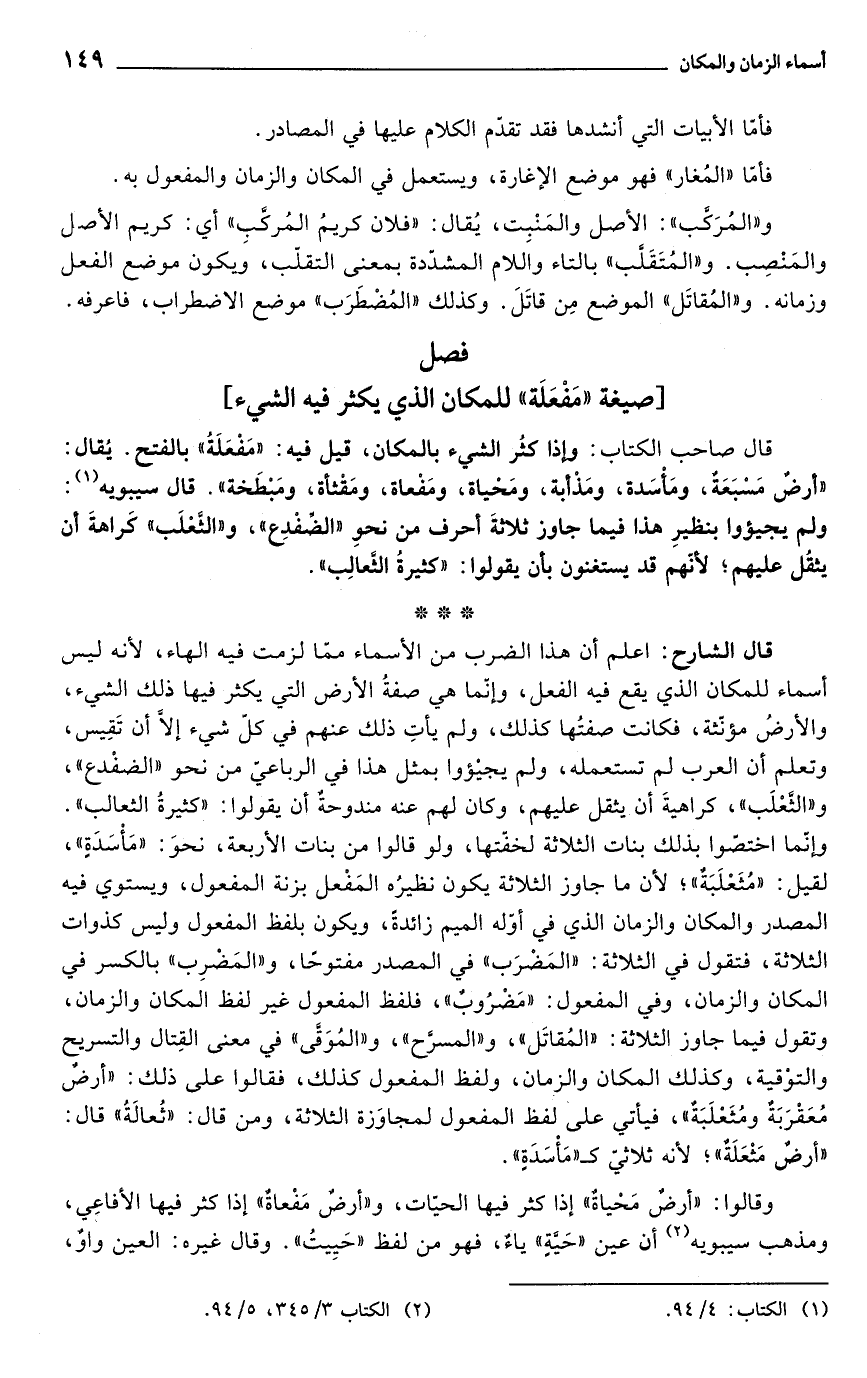 قال الشارح: اعلم أن هذا الضرب من الأسماء ممّا لزمت فيه الهاء, لأنّه ليس أسماء للمكان الذي يقع فيه الفعل، وإنّما هي صفةُ الأرض التي يكثر فيها ذلك الشيء، والأرضُ مؤنثة، فكانت صفتُها كذلك، ولم يأتِ ذلك عنهم في كل شيء إلَّا أن تَقِيس، وتعلم أن العرب لم تستعمله، ولم يجيْؤوا بمثل هذا في الرباعيّ من نحو "الضفْدع"، و"الثعْلَب"، كراهيةَ أن يثقل عليهم، وكان لهم عنه مندوحةٌ أن يقولوا: "كثيرةُ الثعالب". وإنّما اختضوا بذلك بنات الثلاثة لخفّتها، ولو قالوا من بنات الأربعة، نحوَ: "مَأْسَدَةٍ"، لقيل: "مُثَعْلَبَةٌ"؛ لأن ما جاوز الثلاثة يكون نظيرُه المَفْعل بزنة المفعول، ويستوي فيه المصدر والمكان والزمان الذي في أوّله الميم زائدة، ويكون بلفظ المفعول وليس كذوات الثلاثة، فتقول في الثلاثة: "المَضْرَب" في المصدر مفتوحًا، و"المَضْرِب" بالكسر في المكان والزمان، وفي المفعول: "مَضْرُوبٌ"، فلفظ المفعول غير لفظ المكان والزمان، وتقول فيما جاوز الثلاثة: "المُقاتَل"، و"المسرَّح"، و"المُوَقَّى" في معنى القِتال والتسريح والتوْقية، وكذلك المكان والزمان، ولفظ المفعول كذلك، فقالوا على ذلك: "أرضٌ مُعَقْرَبَةٌ ومُثَعْلَبَةٌ"، فيأتي على لفظ المفعول لمجاوَزة الثلاثة، ومن قال: "ثُعالَةُ" قال: "أرضٌ مَثْعَلَةٌ"؛ لأنّه ثلاثي كـ "مَأسَدَةٍ".
