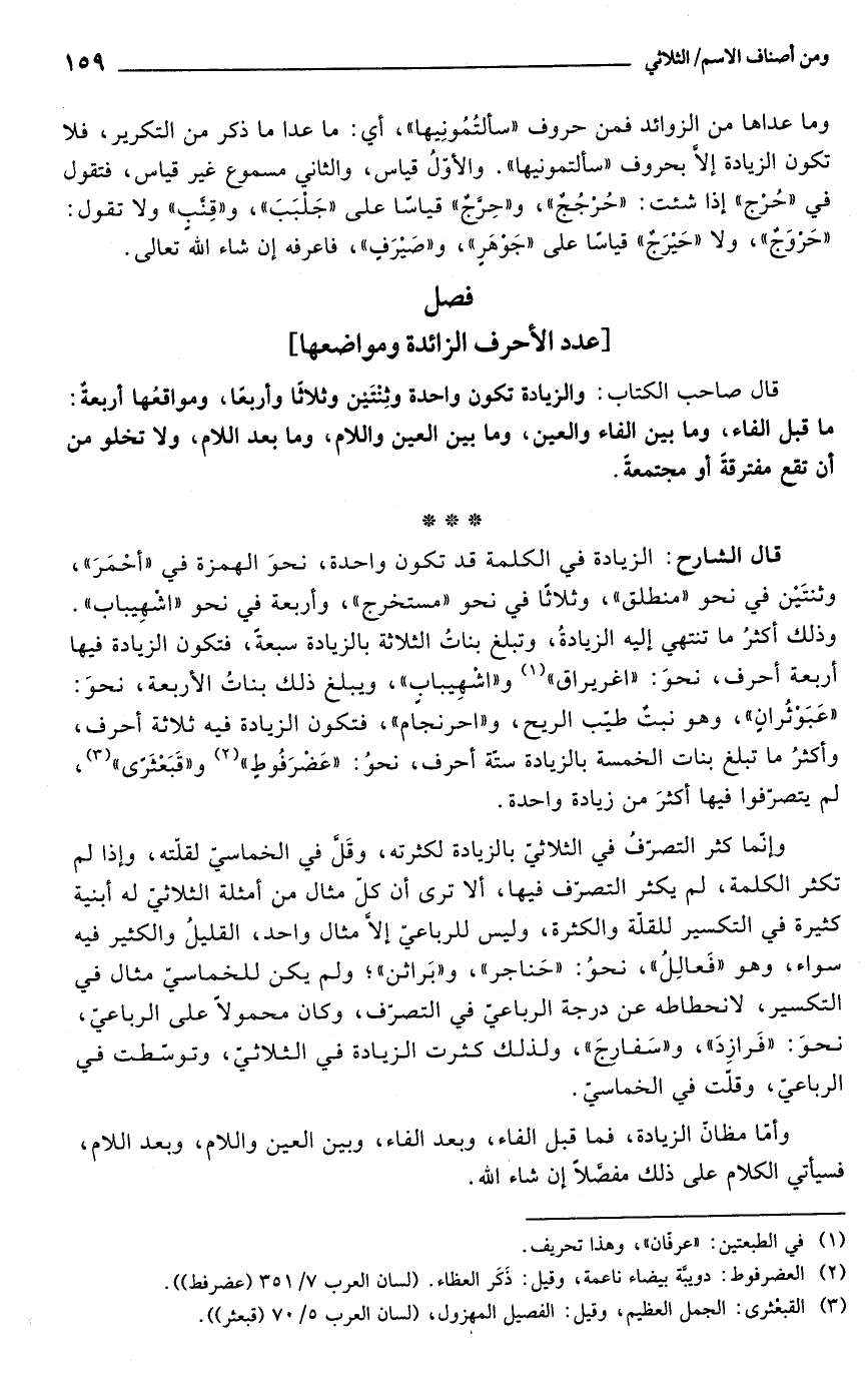 قال الشارح: الزيادة في الكلمة قد تكون واحدة، نحوَ الهمزة في "أحْمَرَ"، وثنتَيْن في نحو "منطلق"، وثلاثًا في نحو "مستخرج"، وأربعة في نحو "اشْهِيباب". وذلك أكثرُ ما تنتهي إليه الزيادةُ، وتبلغ بناتُ الثلاثة بالزيادة سبعةً، فتكون الزيادة فيها أربعة أحرف، نحوَ: "اغريراق" (¬1) و"اشْهِيبابٍ"، ويبلغ ذلك بناتُ الأربعة، نحوَ: "عَبَوْثُرانٍ"، وهو نبتٌ طيّب الريح، و"احرنجَام"، فتكون الزيادة فيه ثلاثة أحرف، وأكثرُ ما تبلغ بنات الخمسة بالزيادة ستّة أحرف، نحوُ: "عَضْرَفُوطٍ" (¬2) و"قَبَعْثَرى" (¬3)، لم يتصرّفوا فيها أكثرَ من زيادة واحدة.