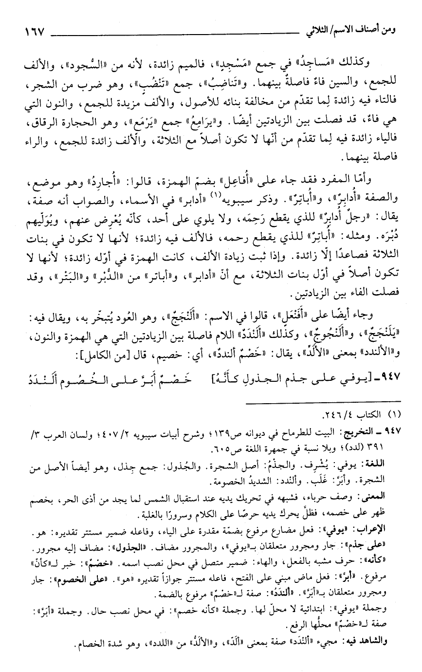 وكذلك "مَساجِدُ" في جمع "مَسْجِدٍ"، فالميم زائدة, لأنه من "السُّجود"، والألف للجمع، والسين فاءٌ فاصلةٌ بينهما. و"تَناضِبُ"، جمع "تَنْضُبٍ"، وهو ضرب من الشجر، فالتاء فيه زائدة لِما تقدّم من مخالفة بنائه للأصول، والألف مزيدة للجمع، والنون التي هي فاءٌ، قد فصلت بين الزيادتين أيضًا. و"يرَامِعُ" جمع "يَرْمَع"، وهو الحجارة الرقاق، فالياء زائدة فيه لِما تقدّم من أنّها لا تكون أصلًا مع الثلاثة، والَألف زائدة للجمع، والراء فاصلة بينهما.