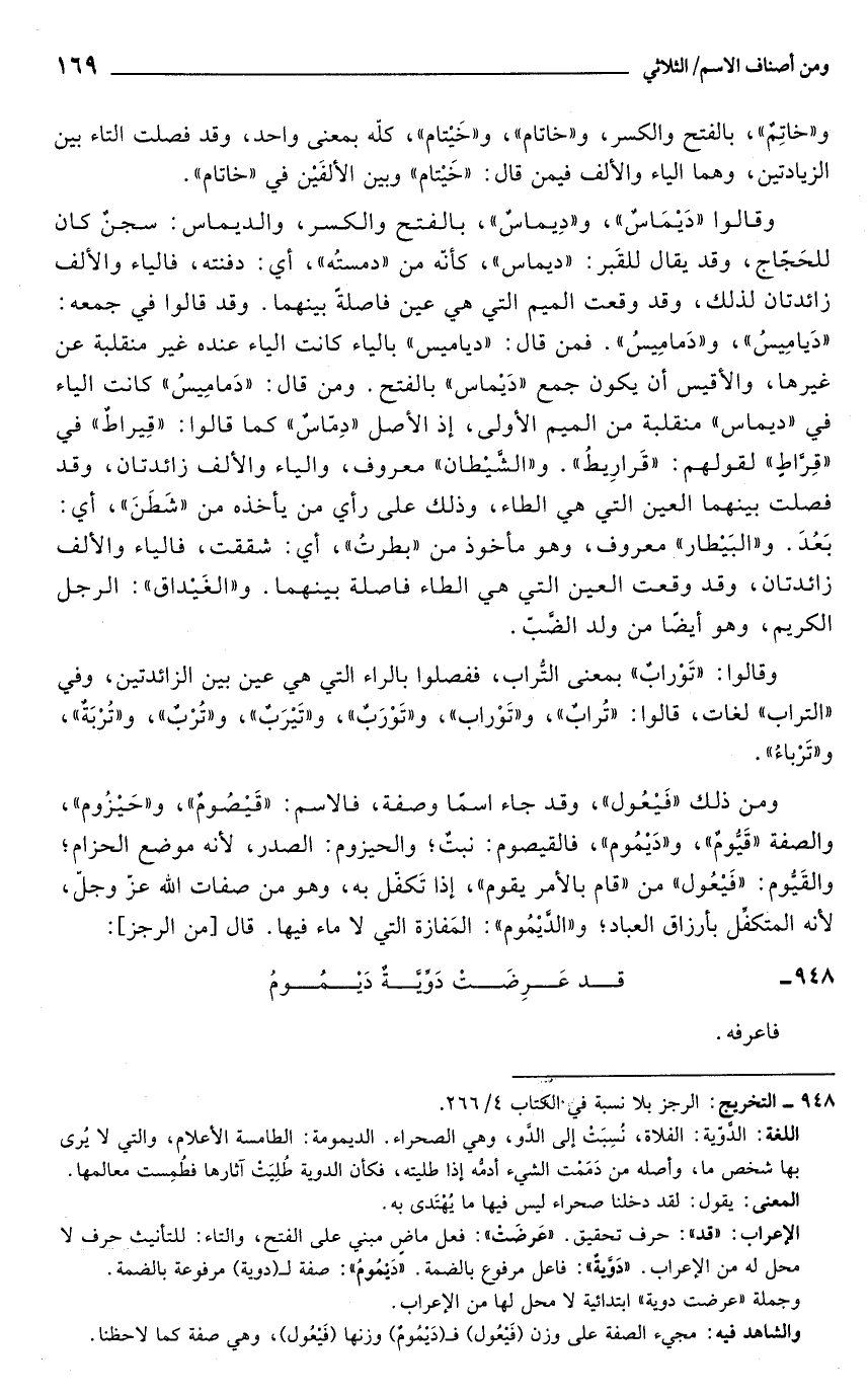 والشاهد فيه: مجيء الصفة على وزن (فَيعُول) فـ (دَيمُومٌ) وزنها (فَيعُول)، وهي صفة كما لاحظنا.