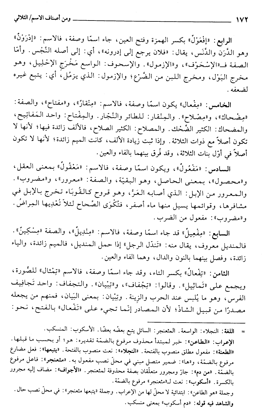 السابع: "مِفْعِيل" قد جاء اسما وصفة، فالاسم: "مِنْدِيلٌ"، والصفة "مِسْكِينٌ". فالمنديل معروف، يقال منه: "تَندّل الرجل" إذا حمل المنديل، فالميم زائدة، والياء زائدة، وفصل بينهما بالنون والدال، وهما الفاء والعين.