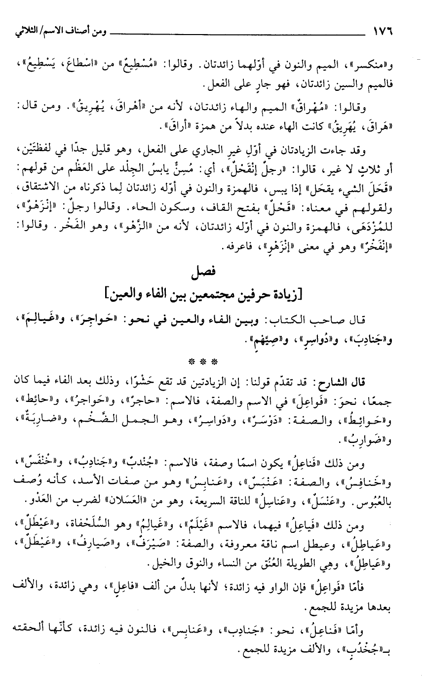 و"منكسر"، الميم والنون في أوّلهما زائدتان. وقالوا: "مُسْطِيعٌ" من "اسْطاعَ، يَسْطِيعُ"، فالميم والسين زائدتان، فهو جارٍ على الفعل.