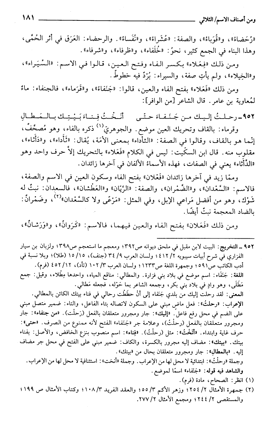 ومِمّا زيد في آخرها زائدان "فَعْلان" بفتح الفاء وسكون العين في الاسم والصفة، فالاسم: "السَّعْدان"، و"الضَّمْران"، والصفة: "الرَّيّان" و"العَطْشان"، فالسعدان: نبتٌ له شَوْك، وهو من أفضل مَراعي الإبل، وفي المثل: "مَرْعى ولا كالسَّعْدان" (¬2)، وضَمْرانٌ: بالضاد المعجمة نبتٌ أيضًا.