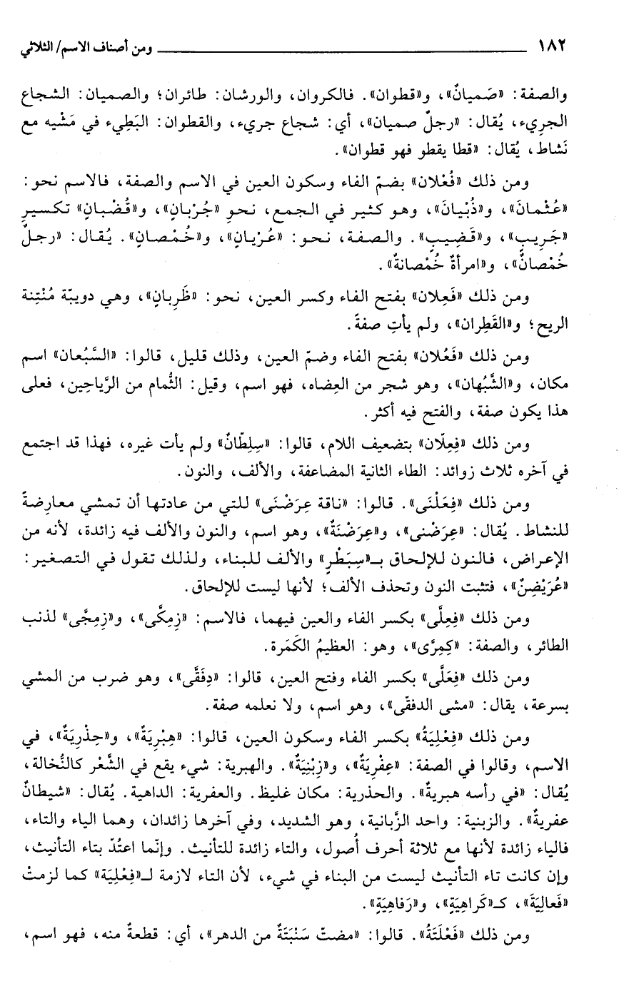ومن ذلك "فُعْلان" بضّم الفاء وسكون العين في الاسم والصفة، فالاسم نحو: "عُثمانَ"، و"ذُبْيانَ"، وهو كثير في الجمع، نحوِ "جُرْبانٍ"، و"قُضْبانٍ" تكسيرِ "جَرِيبِ"، و"قَضِيبٍ". والصفة، نحو: "عُرْيانٍ"، و"خُمْصانٍ".يُقال: "رجلٌ خُمْصانٌ"، و"امرأةٌ خُمْصانةٌ".