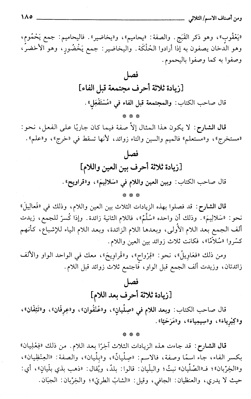 فصل [زيادة ثلاثة أحرف بين العين واللام]