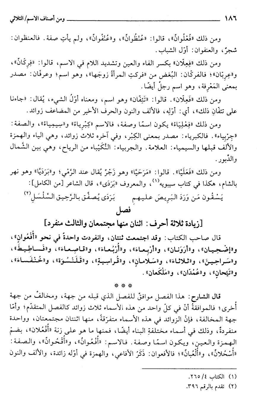 قال الشارح: هذا الفصل موافقٌ للفصل الذي قبله من جهة، ومخالفٌ من جهة أُخرى؛ فالموافقةُ أنّ في كلّ واحد من هذه الأسماء ثلاث زوائد كالفصل المتقدّم؛ وأمّا جهة المخالفة، فإنّ الزوائد في هذه الأسماء متفرّقةً، منها اثنتان مجتمعتان، وواحدة منفردةٌ، وذلك في أسماء مختلفةِ البناء أيضًا، فمنها ما هو على زنة "أُفْعُلان"، بضمّ الهمزة والعين، ويكون اسمًا وصفة. فالاسم: "أُفْعُوانٌ"، و"أُقْحُوانٌ"، والصفة: "أُسْحُلانٌ"، و"أُلْعُبانٌ"؛ فالأفعوان: ذَكَرُ الأفاعي، والهمزة في أوّله زائدة، والألف والنون