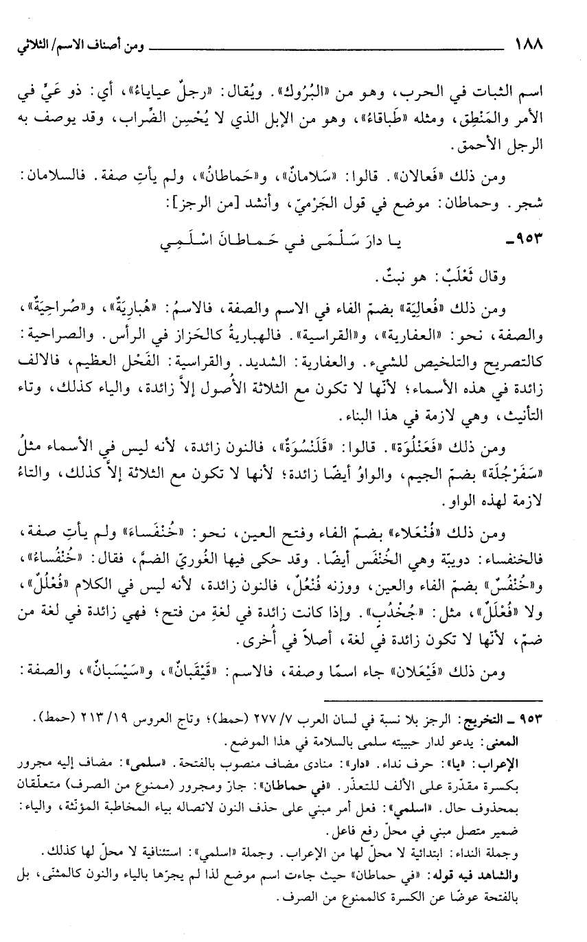 ومن ذلك "فَعالان". قالوا: "سَلامانٌ"، و"حَماطانُ"، ولم يأتِ صفة. فالسلامان: شجر. وحماطان: موضع في قول الجَرْميّ، وأنشد [من الرجز]: