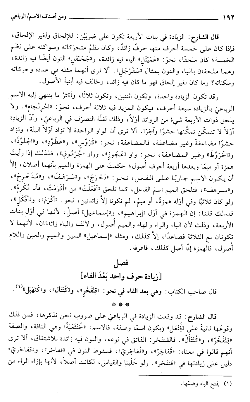 قال الشارح: قد وقعت الزيادة في الرباعيّ على ضروب نحن نذكرها، فمن ذلك وقوعُها ثانية على "فَُِنْعَل" ويكون اسمًا وصفة، فالاسم: "خُنْثَعْبَةٌ" وهي الناقة، والصفة "قِنْفَخْرٌ"، و"كُنْتَأْلٌ". فالقنفخر: الفائق في نوعه، والنون فيه زائدة للاشتقاق، ألا ترى أنهم قالوا في معناه: "قُفاخِرٌ"، و"قُفاخِريّ"، فسقوط النون في "قفاخر"، و"قفاخريّ" دليل على زيادتها في "قنفخر". ولو خُلّينا والقياسَ، لكانت أصلًا, لأنها بإزاء الراء من
