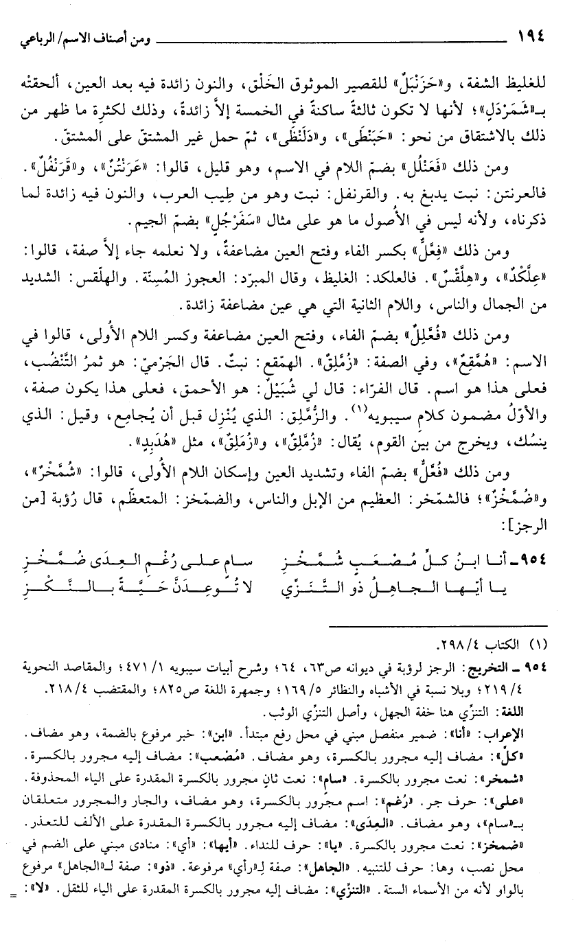 للغليظ الشفة، و"حَزَنْبَلٌ" للقصير الموثوق الخَلْق، والنون زائدة فيه بعد العين، ألحقتْه بـ"شَمَردَلٍ"؛ لأنها لا تكون ثالثة ساكنة في الخمسة إلَّا زائدة، وذلك لكثرِة ما ظهر من ذلك بالاشتقاق من نحو: "حَبَنْطَى"، و"دَلَنْظَى"، ثمّ حمل غير المشتقّ على المشتقّ.