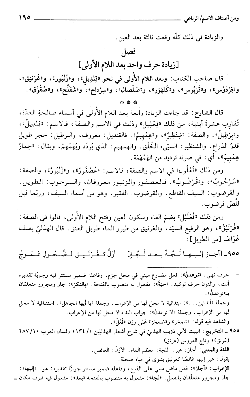 قال الشارح: قد جاءت الزيادة رابعة بعد اللام الأُولى في أسماء صالحةِ العدّة، تُقارِب عشرةَ أبنية، من ذلك "فِعْلِيل" وذلك في الاسم والصفة، فالاسم: "قِنْدِيلٌ"، و"بِرْطِيلٌ". والصفة: " شِنْظِيرٌ"، و"هِمْهِيمٌ". فالقنديل: معروف، والبرطيل: حجر طويل قدرُ الذراع. والشنظير: السيّىء الخُلْق. والهمهيم: الذي يُردّد ويُهَمْهِمْ، ويقال: "حِمارٌ هِمْهِيمٌ"، أي: في صوته ترديد من الهَمْهَمَة.