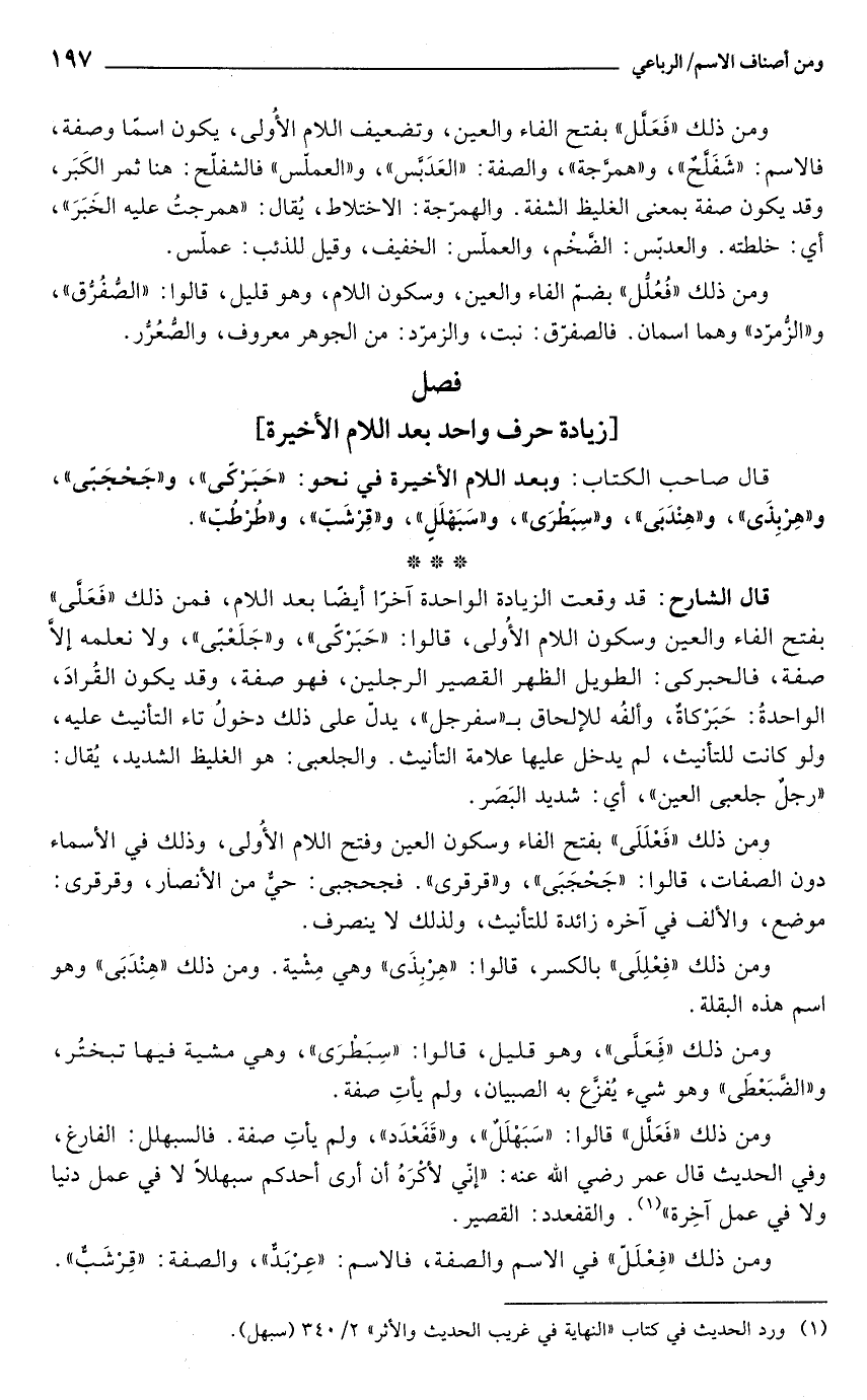 ومن ذلك "فَعَلَّل" قالوا: "سَبَهْلَلٌ"، و"قَفَعْدَد"، ولم يأتِ صفة. فالسبهلل: الفارغ، وفي الحديث قال عمر رضي الله عنه: "إنّي لأكْرَهُ أن أرى أحدكم سبهللًا لا في عمل دنيا ولا في عمل آخِرة" (¬1). والقفعدد: القصير.