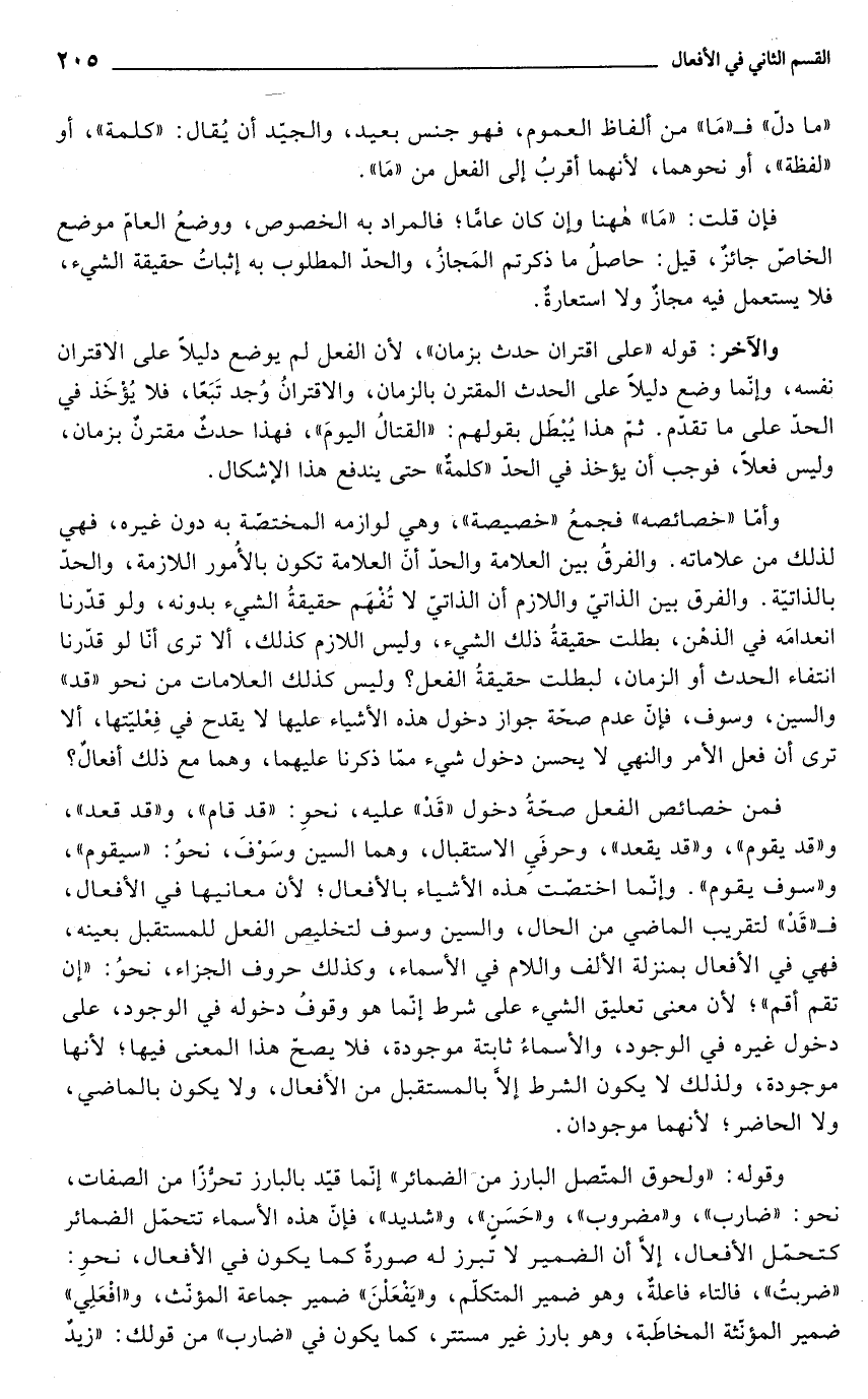والآخر: قوله "على اقتران حدث بزمان", لأن الفعل لم يوضع دليلًا على الاقتران نفسه، وإنمّا وضع دليلاً على الحدث المقترن بالزمان، والاقترانُ وُجد تَبَعًا، فلا يُؤْخَذ في الحدّ على ما تقدّم. ثمّ هذا يُبْطَل بقولهم: "القتالُ اليومَ"، فهذا حدثٌ مقترنٌ بزمان، وليس فعلاً، فوجب أن يؤخذ في الحدّ "كلمةٌ" حتى يندفع هذا الإشكال.