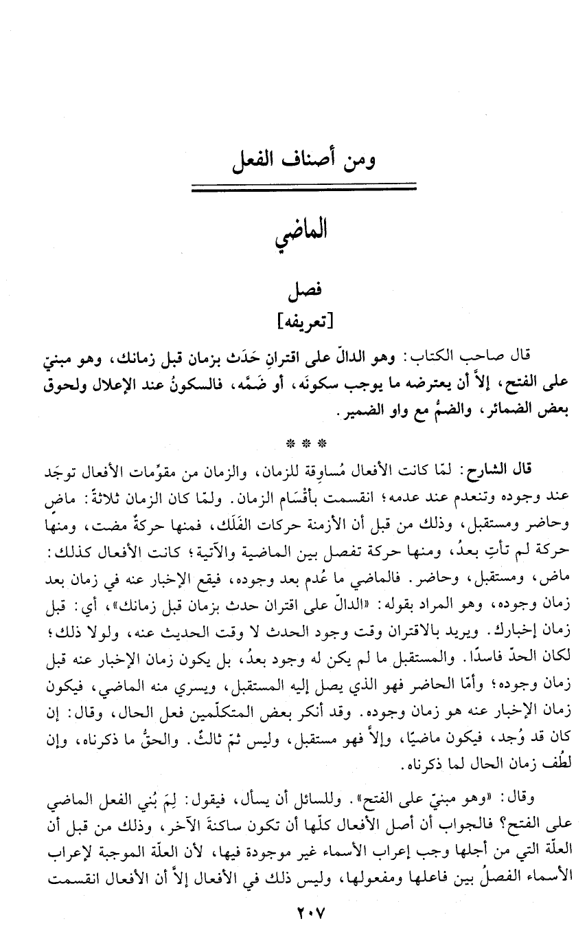 قال الشارح: لمّا كانت الأفعال مُساوِقة للزمان، والزمان من مقوِّمات الأفعال توجَد عند وجوده وتنعدم عند عدمه؛ انقسمت بأقْسَام الزمان. ولمّا كان الزمان ثلاثةً: ماضٍ وحاضر ومستقبل، وذلك من قبل أن الأزمنة حركات الفَلَك، فمنها حركةٌ مضت، ومنها حركة لم تأتِ بعدُ، ومنها حركة تفصل بين الماضية والآتية؛ كانت الأفعال كذلك: ماض، ومستقبل، وحاضر. فالماضي ما عُدم بعد وجوده، فيقع الإخبار عنه في زمان بعد زمان وجوده، وهو المراد بقوله: "الدالّ على اقتران حدث بزمان قبل زمانك"، أي: قبل زمان إخبارك. ويريد بالاقتران وقت وجود الحدث لا وقت الحديث عنه، ولولا ذلك؛ لكان الحدّ فاسدًا. والمستقبل ما لم يكن له وجود بعدُ، بل يكون زمان الإخبار عنه قبل زمان وجوده؛ وأمّا الحاضر فهو الذي يصل إليه المستقبل، ويسري منه الماضي، فيكون زمان الإخبار عنه هو زمان وجوده. وقد أنكر بعض المتكلّمين فعل الحال، وقال: إن كان قد وُجد، فيكون ماضيًا، وإلا فهو مستقبل، وليس ثمّ ثالثٌ. والحقُّ ما ذكرناه، وإن لطُف زمان الحال لما ذكرناه.