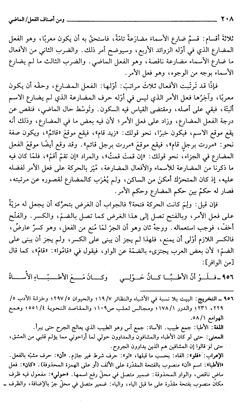 ثلاثةَ أقسام: قسمٌ ضارع الأسماءَ مضارَعةٌ تامّةٌ، فاستحقّ به أن يكون معربًا، وهو الفعل المضارع الذي في أوّله الزوائد الأربع، وسيوضح أمر ذلك. والضرب الثاني من الأفعال ما ضارع الأسماء مضارعة ناقصة، وهو الفعل الماضي. والضرب الثالث ما لم يضارع الأسماء بوجه من الوجوه، وهو فعل الأمر.
