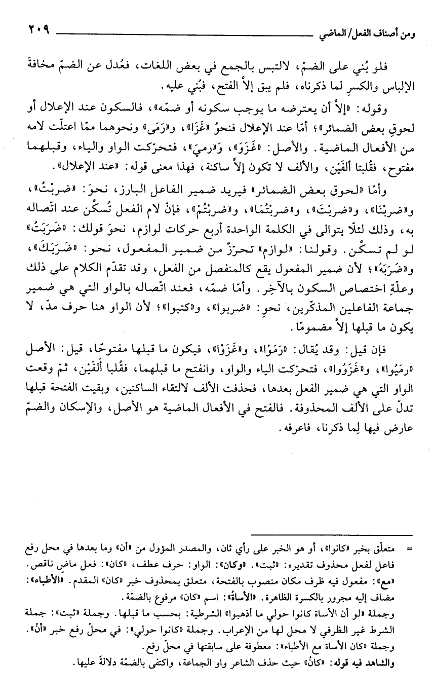 فإن قيل: وقد يُقال: "رَمَوْا"، و"غَزَوْا"، فيكون ما قبلها مفتوحًا، قيل: الأصل "رمَيُوا"، و"غَزَوُوا"، فتحرّكت الياء والواو، وانفتح ما قبلهما، فقُلبا أَلفَين، ثمّ وقعت الواو التي هي ضمير الفعل بعدها، فحذفت الألف لالتقاء الساكنين، وبقيت الفتحة قبلها تدلّ على الألف المحذوفة. فالفتح في الأفعال الماضية هو الأصل، والإسكان والضمّ عارض فيها لِما ذكرنا، فاعرفه.