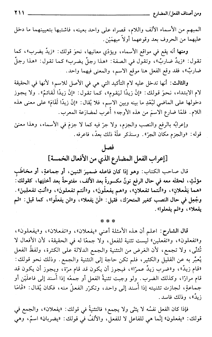 قال الشارح: اعلم أن هذه الأمثلة أعني "يفعلان"، و"تفعلان"، و"يفعلون"، و"تفعلون"، و"تفعلين" ليست تثنية للفعل، ولا جمعًا له في الحقيقة, لأن الأفعال لا تُثنَّى، ولا تجمع, لأن الغرض من التثنية والجمع الدلالة على الكثرة، ولفظُ الفعل يُعبَّر به عن القليل والكثير، فلم تكن حاجة إلى التثنية والجمع. وذلك نحو قولك: "قام زيدٌ"، و"ضرب زيدٌ عمرًا"، فيجوز أن يكون قد قام مرّة، ويجوز أن يكون قد قام مرارًا، وكذلك الضرب. ولو وجبت تثنيةُ الفعل أو جمعُه إذا أُسند إلى فاعلَيْن أو جماعةٍ، لجازت تثنيته إذا أُسند إلى واحد، وتكرّر الفعلُ منه، فكان يُقال: "قَامَا زيدٌ" وذلك فاسد.