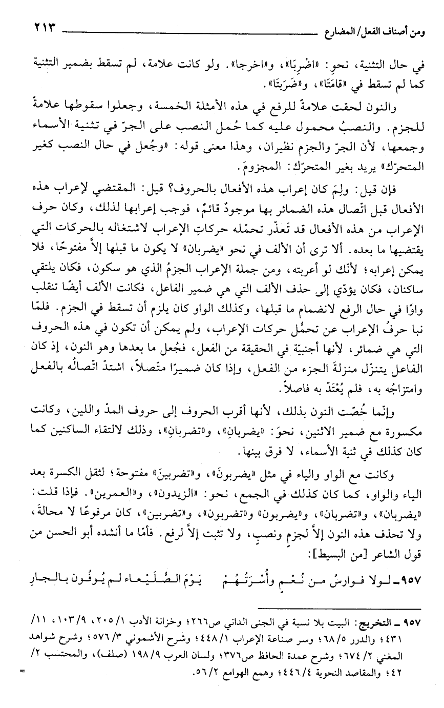 وكانت مع الواو والياء في مثل "يضربونَ"، و"تضربينَ" مفتوحة؛ لثقل الكسرة بعد الياء والواو، كما كان كذلك في الجمع، نحو: "الزيدون"، و"العمرين". فإذا قلت: "يضربان"، و"تضربان"، و"يضربون" و"تضربون"، و"تضربين"، كان مرفوعًا لا محالةَ، ولا تحذف هذه النون إلَّا لجزمٍ ونصبٍ، ولا تثبت إلَّا لرفع. فأمّا ما أنشده أبو الحسن من قول الشاعر [من البسيط]: