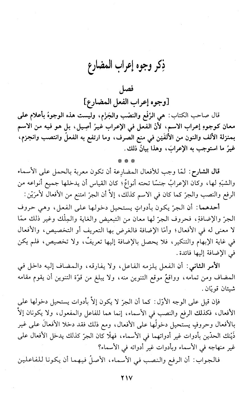 قال الشارح: لَمّا وجب للأفعال المضارِعة أن تكون معربة بالحمل على الأسماء والشبَهِ لها، وكان الإعرابُ جنسًا تحته أنواعٌ؛ كان القياس أن يدخلها جميع أنواعه من الرفع والنصب والجرّ كما كان في الاسم كذلك، إلَّا أن الجرّ امتنع من الأفعال لأمرَيْن: