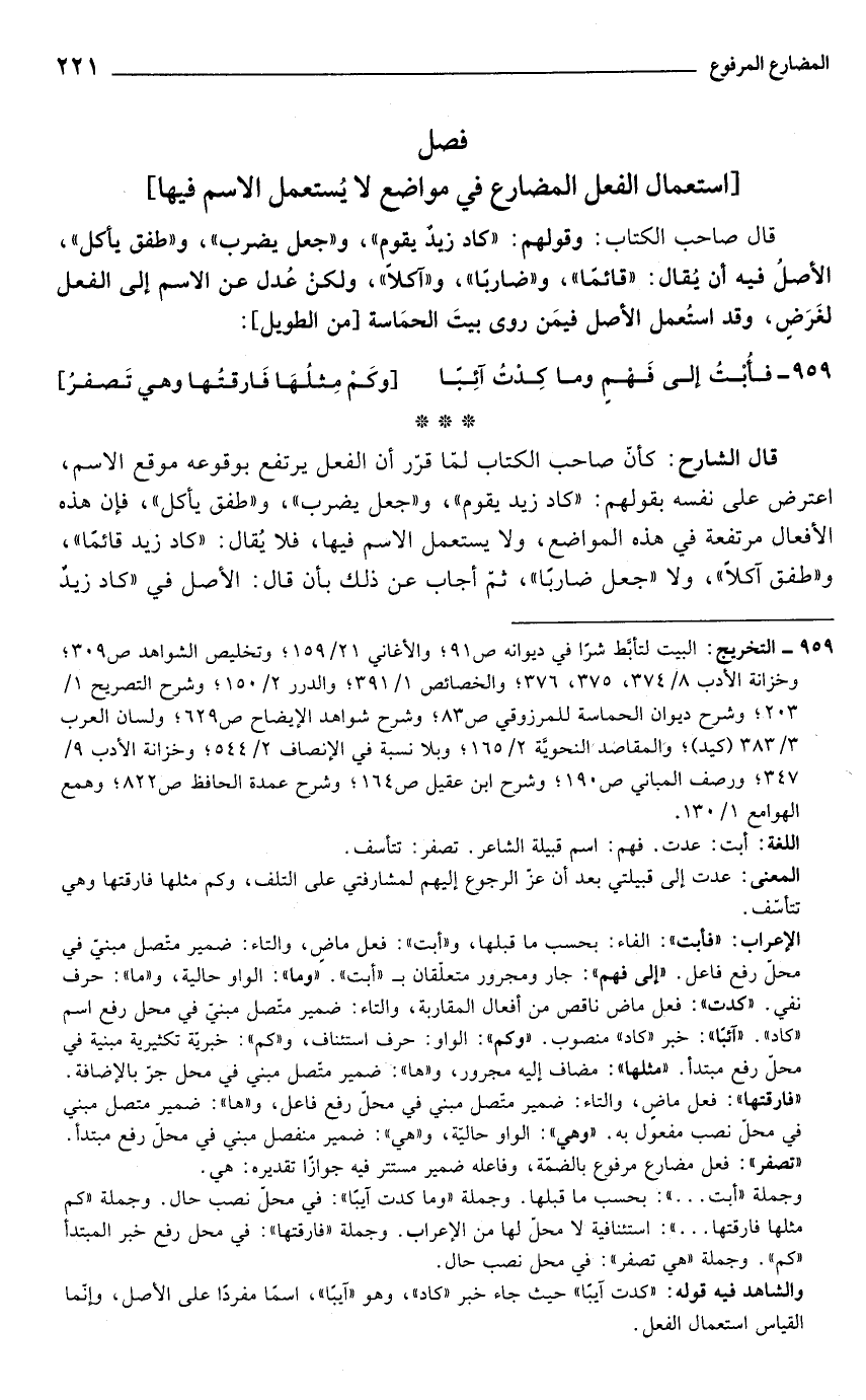 قال صاحب الكتاب: وقولهم: "كاد زيد يقوم", و"جعل يضرب", و"طفق يأكل"، الأصل فيه أن يقال قائماً وضارباً وآكلاً ولكن عدل عن الاسم إلى الفعل لغرضٍ, وقد استعمل الأصل فيمن روى بيت الحماسة [من الطويل]: