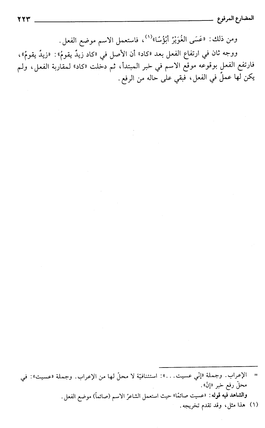 ووجه ثان في ارتفاع الفعل بعد "كاد" أن الأصل في "كاد زيدٌ يقومُ": "زيدٌ يقومُ"، فارتفع الفعل بوقوعه موقع الاسم في خبر المبتدأ، ثم دخلت "كاد" لمقاربة الفعل، ولم يكن لها عملٌ في الفعل، فبقي على حاله من الرفع.