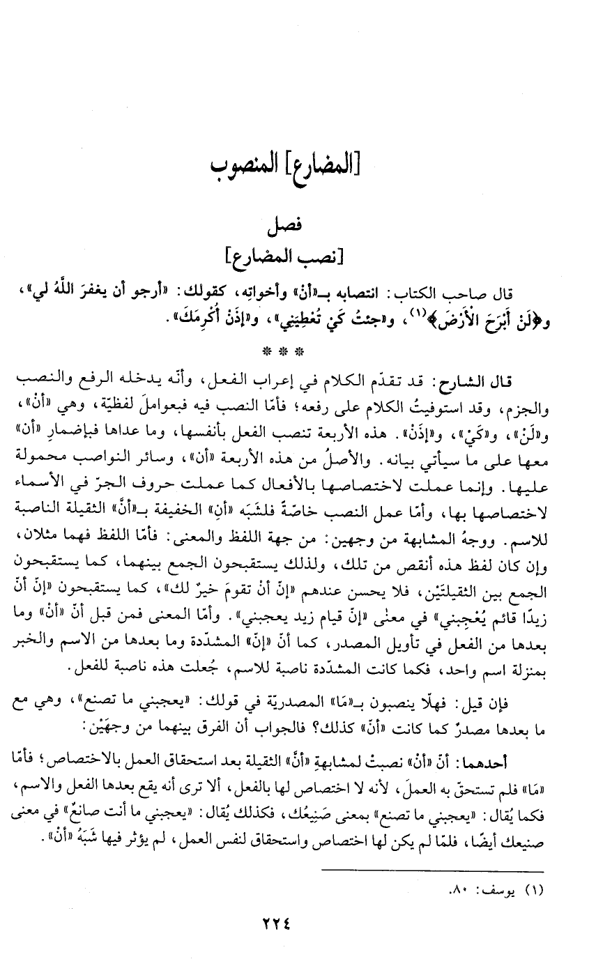 قال الشارح: قد تقدّم الكلام في إعراب الفعل، وأنّه يدخله الرفع والنصب والجزم، وقد استوفيتُ الكلام على رفعه؛ فأمّا النصب فيه فبعواملَ لفظية، وهي "أنْ"، و"لَن"، و"كَي"، و"إذَنْ". هذه الأربعة تنصب الفعل بأنفسها، وما عداها فبإضمارِ "أن" معها على ما سيأتي بيانه. والأصلُ من هذه الأربعة "أن"، وسائر النواصب محمولة عليها. وإنما عملت لاختصاصها بالأفعال كما عملت حروف الجرّ في الأسماء لاختصاصها بها، وأمّا عمل النصب خاصة فلشَبَه "أنِ" الخفيفة بـ"أنَّ" الثقيلة الناصبة للاسم. ووجهُ المشابهة من وجهين: من جهة اللفظ والمعنى: فأمّا اللفظ فهما مثلان، وإن كان لفظ هذه أنقص من تلك، ولذلك يستقبحون الجمع بينهما، كما يستقبحون الجمع بين الثقيلتَين، فلا يحسن عندهم "إنّ أنْ تقوم خيرٌ لك"، كما يستقبحون "إنّ أنَّ زيدًا قائم يُعجِبني" في معنى "إن قيام زيد يعجبنى". وأمّا المعنى فمن قبل أنّ "أن" وما بعدها من الفعل في تأويل المصدر، كما أنَّ "إنّ" المشدّدة وما بعدها من الاسم والخبر بمنزلة اسم واحد، فكما كانت المشدّدة ناصبة للاسم، جُعلت هذه ناصبة للفعل.