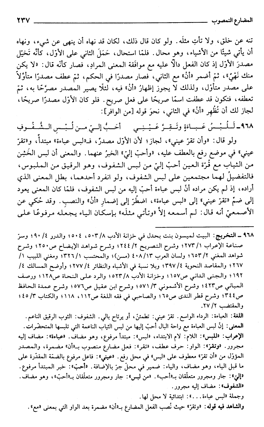 ولو قال: "وأن تقرّ عيني"، لجاز؛ لأنّ الأول مصدرٌ، فـ "لبس عباءة" مبتدأٌ، و"تقرّ عيني" في موضع رفع بالعطف عليه، "وأحبّ إليّ" الخبرُ عنهما. والمعنى أن لبس الخَشِن من الثياب مع قُرّة العين أحبّ إليّ من لبس الشفوف، وهو الرقيق من الملبوس، فالتفضيلُ لهما مجتمعين على لبس الشفوف، ولو انفرد أحدهما، بطل المعنى الذي أراده، إذ لم يكن مراده أن لبس عباءة أحبّ إليه من لبس الشفوف، فلمّا كان المعنى يعود إلى ضمِّ "تقرّ عيني" إلى "لبس عباءة"، اضطُرّ إلى إضمارِ "أنْ" والنصب. وقد حُكي عن الأصمعي أنه قال: لم أسمعه إلَّا "وتأتي مثلَه" بإسكان الياء يجعَله مرفوعًا على