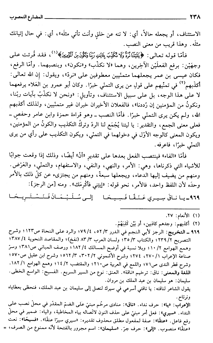 الإعراب: "يا": حرف نداء. "ناق": منادى مرخّم مبنيّ على الضمّ المقدّر في محلّ نصب على النداء."سيري": فعل أمر مبني على حذف النون لاتّصاله بياء المخاطبة، والياء: ضمير في محلّ رفع فاعل. "عنقًا": صفة لمفعول مطلق محذوف تقديره: "سيري سيرًا عنقًا"."فسيحًا": نعت "عنقًا" منصوب. "إلى": حرف جرّ. "سليمان": اسم مجرور بالفتحة لأنه ممنوع من الصرف، =