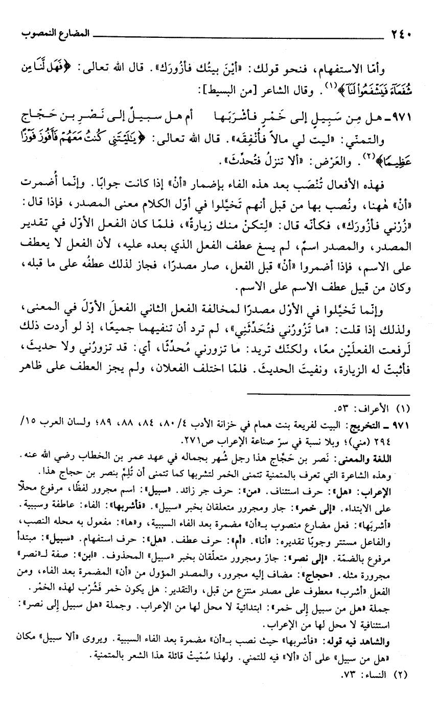 الإعراب: "هل": حرف استئناف. "من": حرف جر زائد. "سبيل": اسم مجرور لفظًا، مرفوع محلًا على الابتداء. "إلى خمر": جار ومجرور متعلقان بخبر "سبيل". "فأشربها": الفاء: عاطفة وسببية. "أشربَها": فعل مضارع منصوب بـ"أن" مضمرة بعد الفاء السببية، و"ها": مفعول به محله النصب، والفاعل مستتر وجوبًا تقديره: "أنا". "أم": حرف عطف. "هل": حرف استفهام. "سبيل": مبتدأ مرفوع بالضمّة. "إلى نصر": جار ومجرور متعلّقان بخبر "سبيل" المحذوف. "ابن": صفة لـ"نصر" مجرورة مثله. "حجاج": مضاف إليه مجرور، والمصدر المؤول من "أن" المضمرة بعد الفاء، ومن الفعل "أشرب" معطوف على مصدر منتزع من قبل، والتقدير: هل يكون خمر فَشُرْب لهذه الخمْر.
