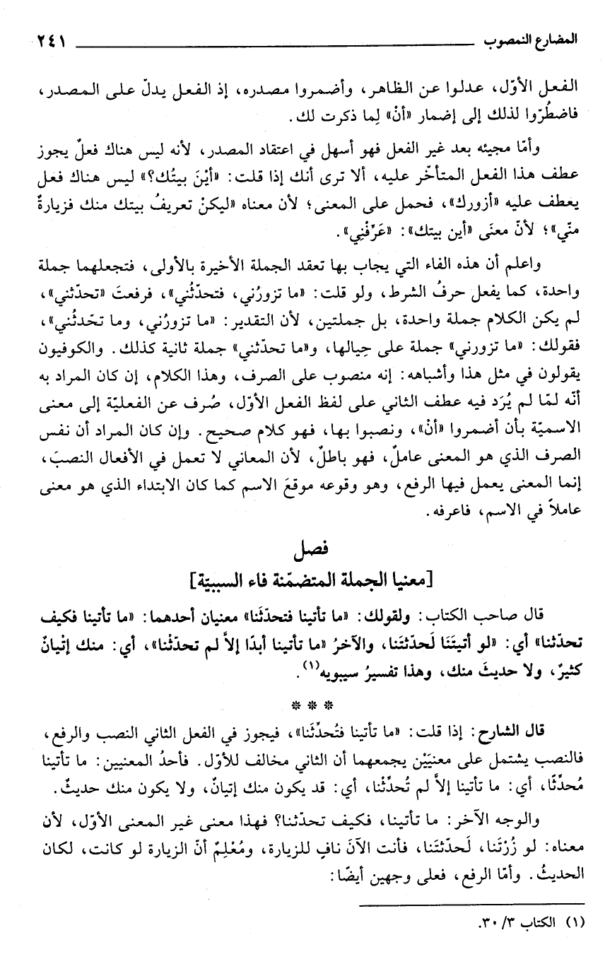 واعلم أن هذه الفاء التي يجاب بها تعقد الجملة الأخيرة بالأولى، فتجعلهما جملة واحدة، كما يفعل حرفُ الشرط، ولو قلت: "ما تزورُني، فتحدّثُني"، فرفعتَ "تحدّثني"، لم يكن الكلام جملة واحدة، بل جملتين, لأنّ التقدير: "ما تزورُني، وما تحّدثُني"، فقولك: "ما تزورني" جملة على حِيالها، و"ما تحدّثني" جملة ثانية كذلك. والكوفيون يقولون في مثل هذا وأشباهه: إنه منصوب على الصرف، وهذا الكلام، إن كان المراد به أنّه لمّا لم يُرَد فيه عطف الثاني على لفظ الفعل الأول، صُرف عن الفعليّة إلى معنى الاسميّة بأن أضمروا "أنْ"، ونصبوا بها، فهو كلام صحيح. وإن كان المراد أن نفس الصرف الذي هو المعنى عامل، فهو باطل, لأنّ المعاني لا تعمل في الأفعال النصبَ، إنما المعنى يعمل فيها الرفع، وهو وقوعه موقعَ الاسم كما كان الابتداء الذي هو معنى عاملاً في الاسم، فاعرفه.