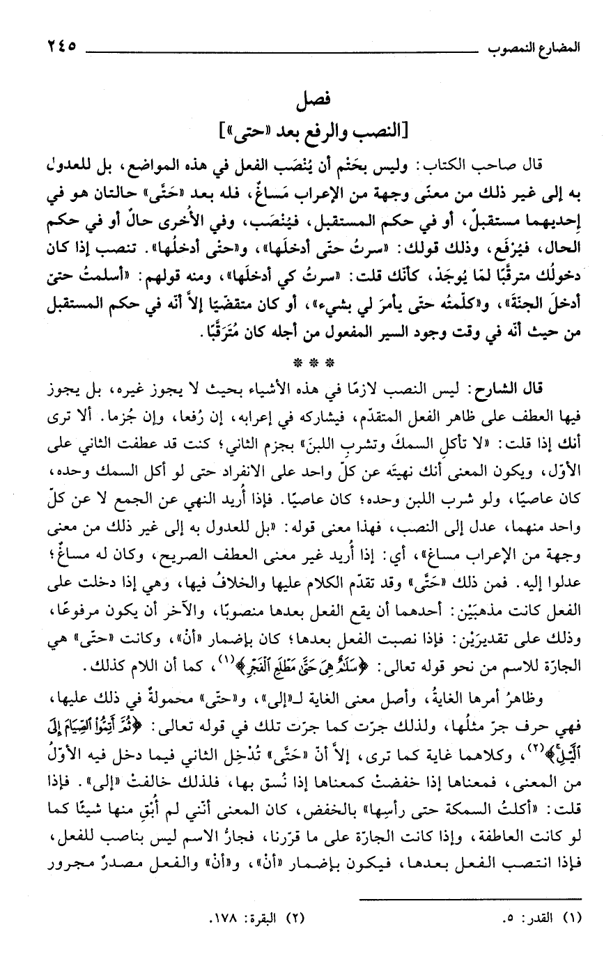 قال الشارح: ليس النصب لازمًا في هذه الأشياء بحيث لا يجوز غيره، بل يجوز فيها العطف على ظاهر الفعل المتقدّم، فيشاركه في إعرابه، إن رُفعا، وإن جُزما. ألا ترى أنك إذا قلت: "لا تأكلِ السمكَ وتشربِ اللبنَ" بجزم الثاني؛ كنت قد عطفت الثاني على الأول، ويكون المعنى أنك نهيتَه عن كل واحد على الانفراد حتى لو أكل السمك وحده، كان عاصيًا، ولو شرب اللبن وحده؛ كان عاصيًا. فإذا أُريد النهي عن الجمع لا عن كل واحد منهما، عدل إلى النصب، فهذا معنى قوله: "بل للعدول به إلى غير ذلك من معنى وجهة من الإعراب مساغ"، أي: إذا أُريد غير معنى العطف الصريح، وكان له مساغٌ؛ عدلوا إليه. فمن ذلك "حَتّى" وقد تقدّم الكلام عليها والخلافُ فيها، وهي إذا دخلت على الفعل كانت مذهبَيْن: أحدهما أن يقع الفعل بعدها منصوبًا، والآخر أن يكون مرفوعًا، وذلك على تقديرَيْن: فإذا نصبت الفعل بعدها؛ كان بإضمار "أنْ"، وكانت "حتى" هي الجارّة للاسم من نحو قوله تعالى: {سَلَامٌ هِيَ حَتَّى مَطْلَعِ الْفَجْرِ} (¬1)، كما أن اللام كذلك.