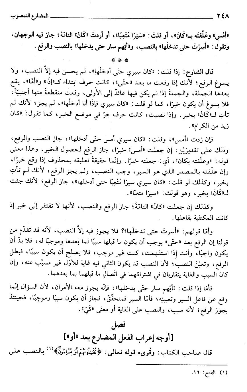 "أمس" وعلقته بـ "كان" أو قلت: "سيرًا متعبًا", أو أردت "كان" التامة؛ جاز فيه الوجهان, وتقول: "أسرت حتى تدخلها" بالنصب, و"أيهم سار حتى يدخلها" بالنصب والرفع.