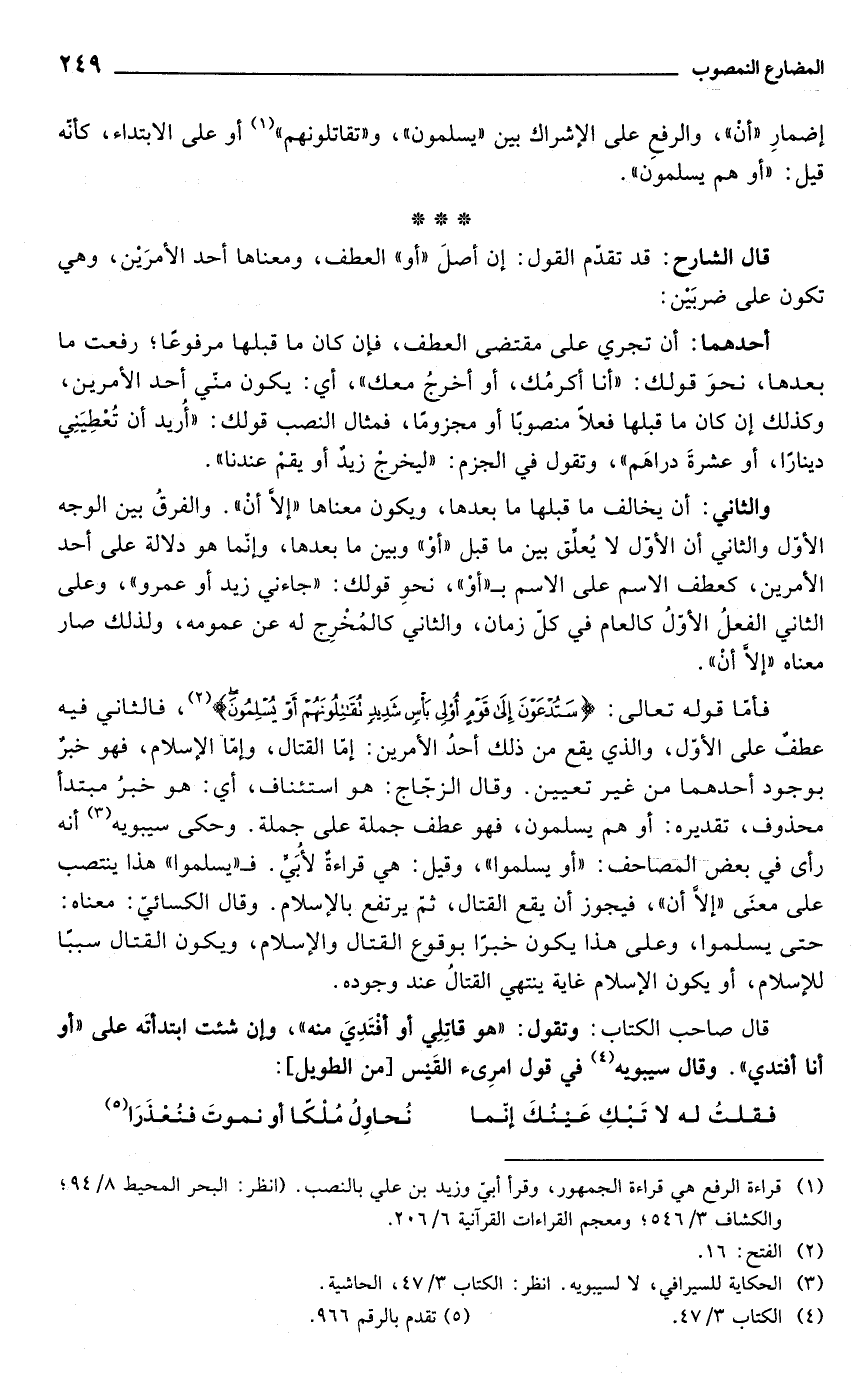 فأما قوله تعالى: {سَتُدْعَوْنَ إِلَى قَوْمٍ أُولِي بَأْسٍ شَدِيدٍ تُقَاتِلُونَهُمْ أَوْ يُسْلِمُونَ} (¬2)، فالثاني فيه عطفٌ على الأول، والذي يقع من ذلك أحدُ الأمرين: إمّا القتال، وإمّا الإِسلام، فهو خبرٌ بوجود أحدهما من غير تعيين. وقال الزجّاج: هو استئناف، أي: هو خبرُ مبتدأ محذوف، تقديره: أو هم يسلمون، فهو عطف جملة على جملة. وحكى سيبويه (¬3) أنه رأى في بعض المصاحف: "أو يسلموا"، وقيل: هي قراءةٌ لأُبَىٍّ. فـ"يسلموا" هذا ينتصب على معنَى "إلَّا أن"، فيجوز أن يقع القتال، ثمّ يرتفع بالإِسلام. وقال الكسائيّ: معناه: حتى يسلموا، وعلى هذا يكون خبرًا بوقوع القتال والإِسلام، ويكون القتال سببًا للإسلام، أو يكون الإِسلام غاية ينتهي القتالُ عند وجوده.
