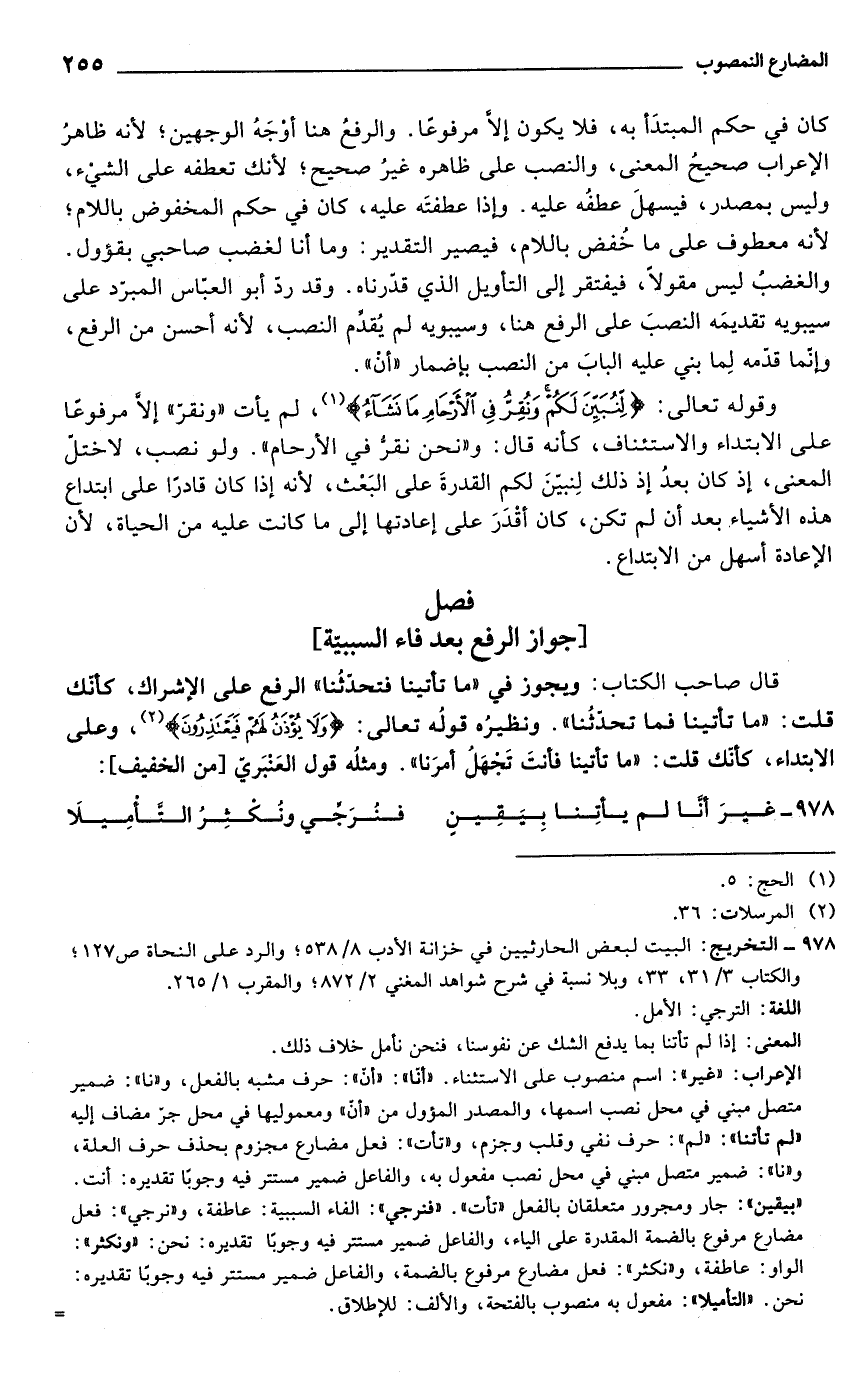 وقوله تعالى: {لِنُبَيِّنَ لَكُمْ وَنُقِرُّ فِي الْأَرْحَامِ مَا نَشَاءُ} (¬1)، لم يأت "ونقرّ"، إلَّا مرفوعًا على الابتداء والاستئناف، كانه قال: و"نحن نقرُّ في الأرحام". ولو نصب، لاختل المعنى، إذ كان بعدُ إذ ذلك لِنبيّن لكم القدرةَ على البَعْث, لأنه إذا كان قادرًا على ابتداع هذه الأشياء بعد أن لم تكن، كان أقدَرَ على إعادتها إلى ما كانت عليه من الحياة, لأنّ الإعادة أسهل من الابتداع.