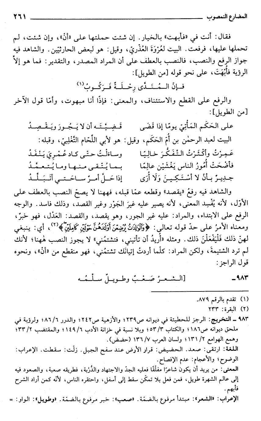 والشاهد فيه رفعُ "يقصد" وقطعه عمّا قبله، فههنا لا يصح النصب بالعطف على الأول؛ لأنه يُفْسِد المعنى, لأنه يصير عليه غيرَ الجَوْر وغير القصد، وذلك فاسد. والوجه الرفع على الابتداء، والمراد: عليه غير الجور، وهو يقصد، والقصد: العَدْل، فهو خبرٌ، ومعناه الأمرُ على حد قوله تعالى: {وَالْوَالِدَاتُ يُرْضِعْنَ أَوْلَادَهُنَّ حَوْلَيْنِ كَامِلَيْنِ} (¬2)، أي: ينبغي لهنّ ذلك فَلْيَفْعَلْنَ ذلك. ومثله "أريدُ أن تأتيني، فتشتمُني" لا يجوز النصب ها هنا؛ لأنك لم ترد الشتيمةَ، ولكن المراد: كلّما أردتُ إتيانَك تشتمُني، فهو منقطع من "أنْ"، ونحوه قول الراجز: