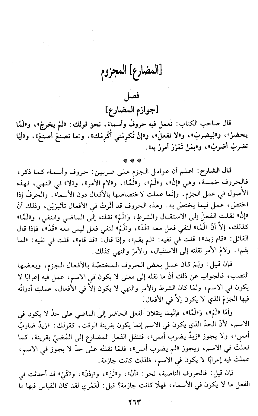 قال الشارح: اعلم أن عوامل الجزم على ضربين: حروف وأسماء كما ذكر، فالحروف خمسة، وهي "إنْ"، و"لَمْ"، و"لَمَّا"، و"لام الأمر"، و"لا" في النهي، فهذه الأُصول في عمل الجزم. وإنّما عملت لاختصاصها بالأفعال دون الأسماءَ. والحرفُ إذا اختصّ، عمل فيما يختص به. وهذه الحروف قد أثّرتْ في الأفعال تأثيرَيْن، وذلك أن "إنْ" نقلت الفعلَ إلى الاستقبال والشرطِ، و"لَمْ" نقلته إلى الماضي والنفي، و"لَمَّا" كذلك، إلَّا أن "لَمَّا" لنفي فعل معه "قَدْ"، و"لَمْ" لنفي فعل ليس معه "قَدْ"، فإذا قال القائل: "قام زيد"؛ قلت في نفيه: "لم يقم"، وإذا قال: "قد قام"، قلت في نفيه: "لما يقم". ولامُ الأمر نقلته إلى الاستقبال، والأمرُ والنهي كذلك.