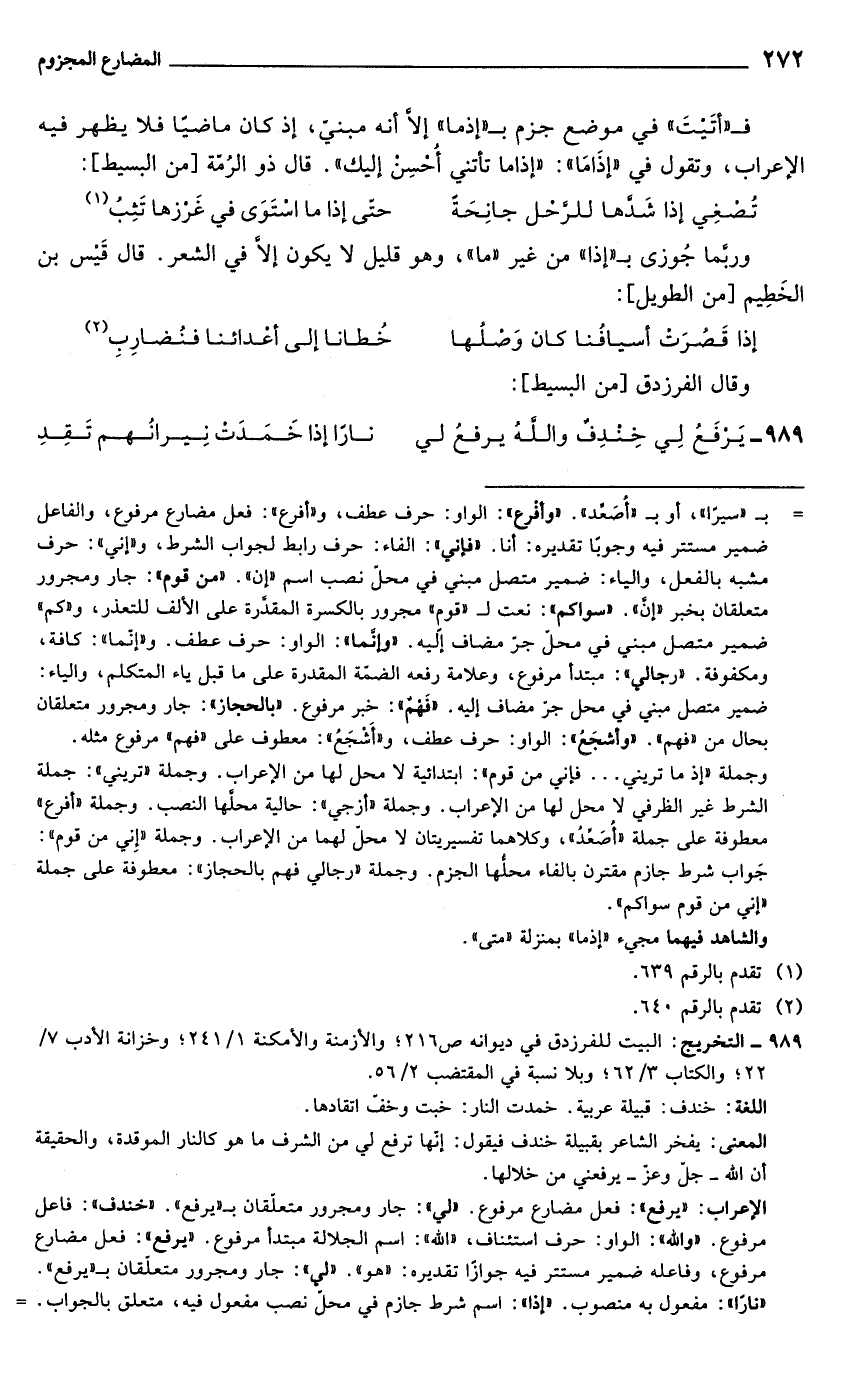 989 - التخريج: البيت للفرزدق في ديوانه ص 216؛ والأزمنة والأمكنة 1/ 241؛ وخزانة الأدب 7/ 22؛ والكتاب 3/ 62؛ وبلا نسبة في المقتضب 2/ 56.