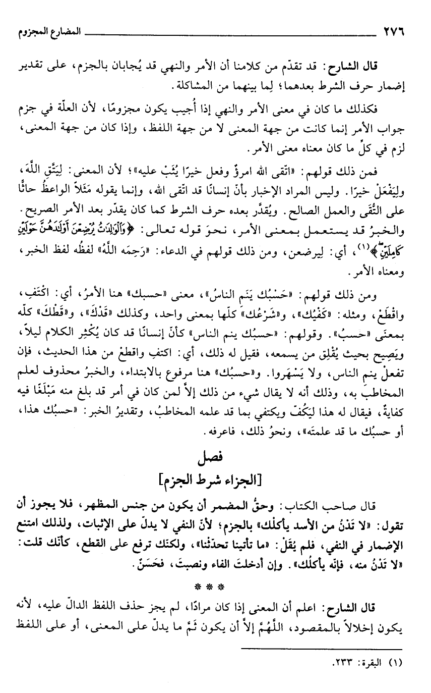 قال الشارح: قد تقدّم من كلامنا أن الأمر والنهي قد يُجابان بالجزم، على تقدير إضمار حرف الشرط بعدهما؛ لِما بينهما من المشاكلة.