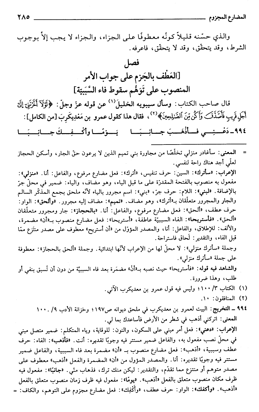قال صاحب الكتاب: وسأل سيبويه الخليل (¬1) عن قوله عز وجل: {لَوْلَا أَخَّرْتَنِي إِلَى أَجَلٍ قَرِيبٍ فَأَصَّدَّقَ وَأَكُنْ مِنَ الصَّالِحِينَ} (¬2) , فقال هذا كقول عمرو بن معد يكرب [من الكامل]: