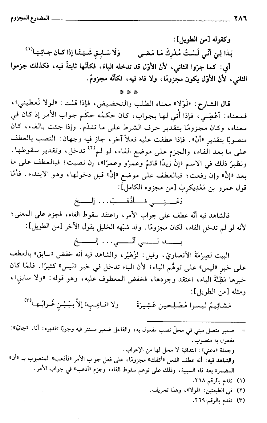 قال الشارح: "لَوْلا" معناه الطلب والتحضيض، فإذا قلت: "لولا تُعطيني"، فمعناه: أعْطِني، فإذا أُتي لها بجواب، كان حكمُه حكم جواب الأمر إذ كان في معناه، وكان مجزومًا بتقدير حرف الشرط على ما تقدّم. وإذا جئت بالفاء، كان منصوبًا بتقديرِ "أن". فإذا عطفت عليه فعلاً آخر، جاز فيه وجهان: النصب بالعطف على ما بعد الفاء، والجزم على موضع الفاء، لو لم (¬2) تدخل، وتقدير سقوطها. ونظيرُ ذلك في الاسم "إن زيداً قائم وعمرٌو وعمرًا"، إن نصبت؛ فبالعطف على ما بعد "إنَّ" وإن رفعت؛ فبالعطف على موضعِ "إن" قبل دخولها، وهو الابتداء. فأمّا قول عمرو بن مَعدِيكَرِبَ [من مجزوء الكامل]:
