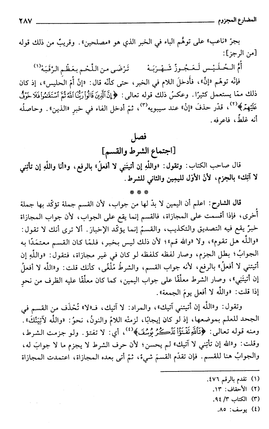 وتقول: و"اللَه إن أتيتني آتيك"، والمراد: لا آتيك، فـ "لا" تُحْذَف من القسم في الجحد للعلم بموضعها، إذ لو كان إيجابًا، لزمتْه اللامُ والنونُ، نحوُ: "والله لآتِيَنكَ". ومنه قوله تعالى: {تَاللَّهِ تَفْتَأُ تَذْكُرُ يُوسُفَ} (¬4)، أي: لا تفتؤ. ولو جزمت الشرط، وقلت: و"الله إن تأتِني لا آتيك" لم يحسن؛ لأن حرف الشرط لا يجزم ما لا جوابَ له، والجوابُ هنا للقسم. فإن تقدّم القسمَ شيء، ثم أتى بعده المجازاة، اعتمدت المجازاة
