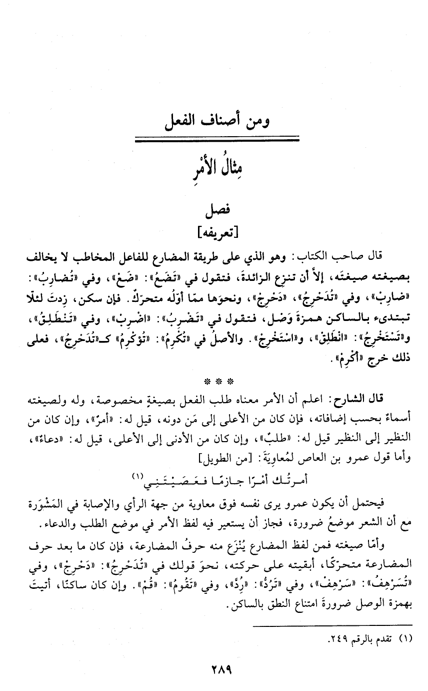 قال الشارح: اعلم أن الأمر معناه طلب الفعل بصيغيةٍ مخصوصة، وله ولصيغته أسماءٌ بحسب إضافاته، فإن كان من الأعلى إلى مَن دونه، قيل له: "أمر"، وإن كان من النظير إلى النظير قيل له: "طلبٌ"، وإن كان من الأدنى إلى الأعلى، قيل له: "دعاءٌ"، وأما قول عمرو بن العاص لمُعاوِيَةَ: [من الطويل]