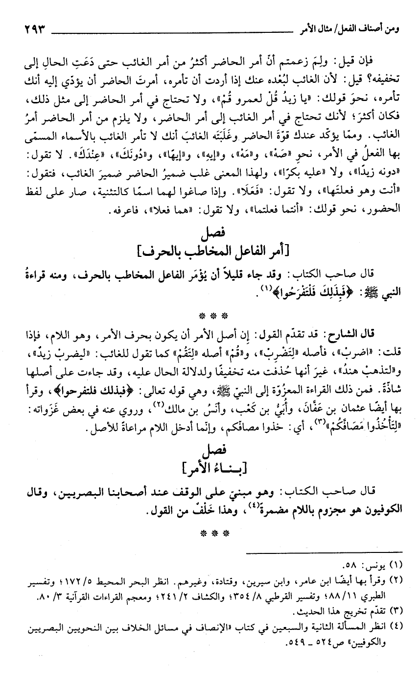 قال الشارح: قد تقدّم القول: إِن أصل الأمر أن يكون بحرف الأمر، وهو اللام، فإذا قلت: "اضربْ"، فأصله "لِتَضرِبْ"، و"قُم" أصله "لِتَقُمْ" كما تقول للغائب: "ليضربْ زيدٌ"، و"لتذهب هندُ"، غيرَ أنها حُذفت منه تخفيفًا ولدلالة الحال عليه، وقد جاءت على أصلها شاذة. فمن ذلك القراءة المعزُوة إلى النبي - صلى الله عليه وسلم -، وهي قوله تعالى: {فبذلك فلتفرحوا}، وقرأ بها أيضًا عثمان بن عَفانَ، وأُبَي بن كَعْب، وأنسُ بن مالك (¬2)، وروي عنه في بعض غَزَواته: "لِتَأخُذُوا مَصافكُمْ" (¬3)، أي: خذوا مصافكم، وإنّما أدخل اللام مراعاة للأصل.