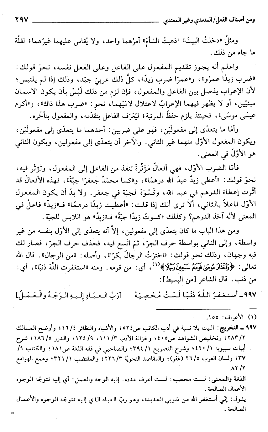 ومن هذا الباب ما كان يتعدّي إلى مفعولين، إلّا أنه يتعدّي إلى الأول بنفسه من غير واسطة، وإلى الثاني بواسطة حرف الجرّ، ثم اتسع فيه، فحذف حرف الجرّ، فصار لك فيه وجهان، وذلك نحو قولك: "اخترْتُ الرجالَ بكرًا"، وأصله: "من الرجال". قال الله تعالى: {وَاخْتَارَ مُوسَى قَوْمَهُ سَبْعِينَ رَجُلًا} (¬1)، أي: من قومه. ومنه "استغفرت الله ذنبًا، أي: من ذنب. قال الشاعر [من البسيط]: