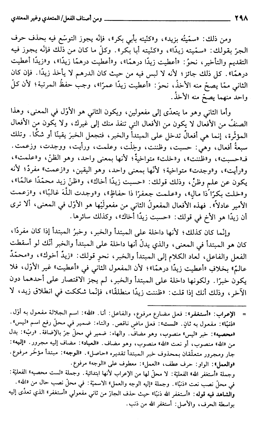 وأما الثاني وهو ما يتعدّي إلى مفعولين، ويكون الثاني هو الأول في المعنى، وهذا الصنفُ من الأفعال لا يكون من الأفعال التي تنفذ منك إلى غيرك، ولا يكون في الأفعال المؤثرة، إنما هي أفعالٌ تدخل على المبتدأ والخبر، فتجعل الخبرَ يقينًا أو شكًّا. وتلك سبعةُ أفعال، وهي: حسبت، وظننت، وخِلْت، وعلمت، ورأيت، ووجدت، وزعمت. فـ"حسبت"، و"ظننت"، و"خلت" متواخيةٌ؛ لأنها بمعنى واحد، وهو الظنّ، و"علمت"، و"رأيت"، و"وجدت" متواخية؛ لأنّها بمعنى واحد، وهو اليقين، و"زعمت" مفردٌ؛ لأنه يكون عن علم وظن، وذلك قولك: "حسبت زيدًا أخاك"، و"ظنّ زيد محمدًا عالمًا"، و"خلت بكرًا ذا مالٍ"، و "علمت جعفرًا ذا حفاظ"، و"وجدت اللهَ غالبًا"، و"زعمت الأمير عادلًا". فهذه الأفعال المفعولُ الثاني من مفعولَيها هو الأول في المعنى، ألا ترى أن زيدًا هو الأخ في قولك: "حسبت زيدًا أخاك"، وكذلك سائرها.
