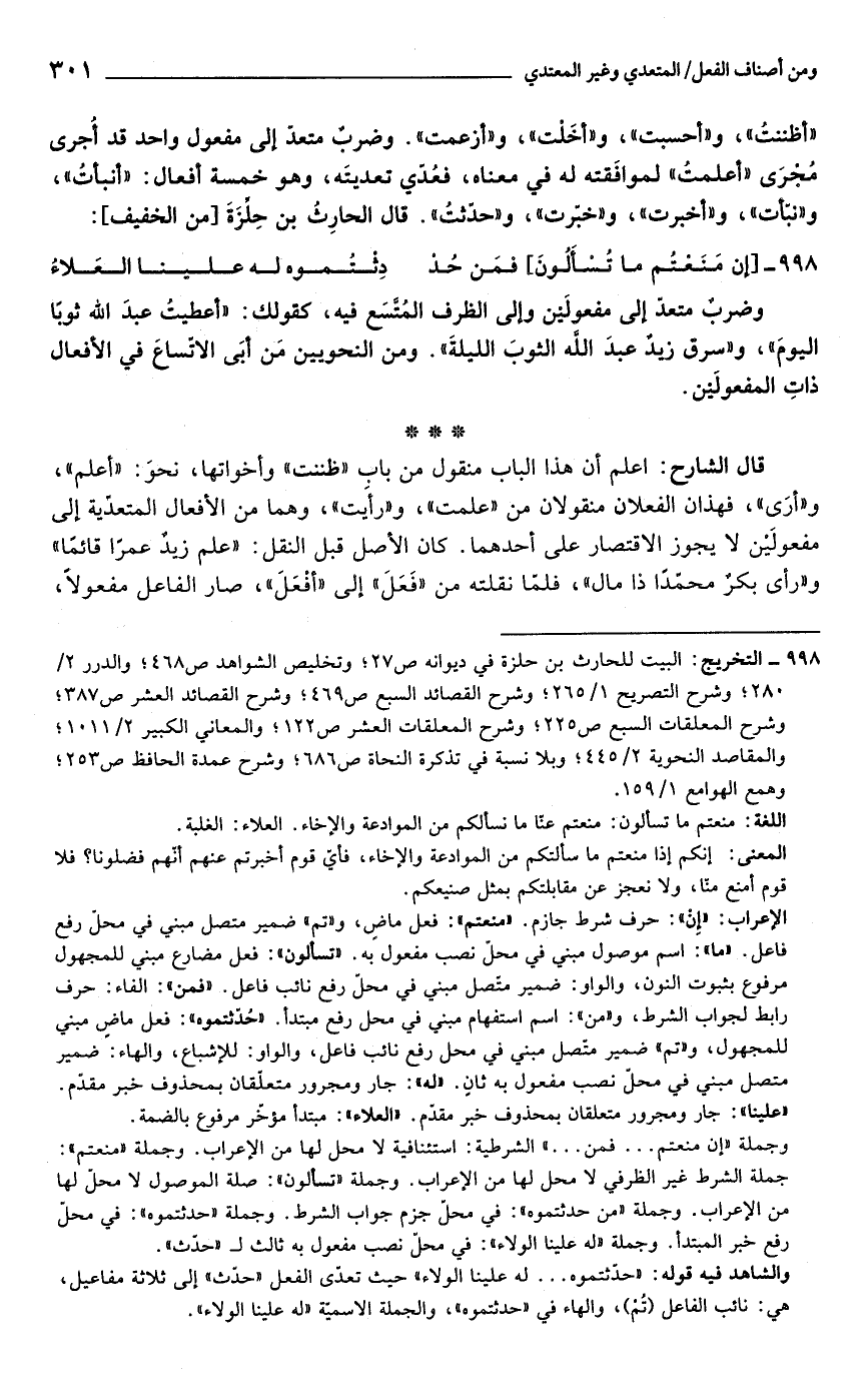 أظننت وأحسبت وأخلت وأزعمت. وضرب متعد إلى مفعول واحد وقد أُجري مجرى أعلمت لموافقته له في معناه, فعدى تعديته، وهو خمسة أفعال: أنبأت ونبأت وأخبرت وخبرت وحدثت. قال الحارث بن حلزة [من الخفيف]: