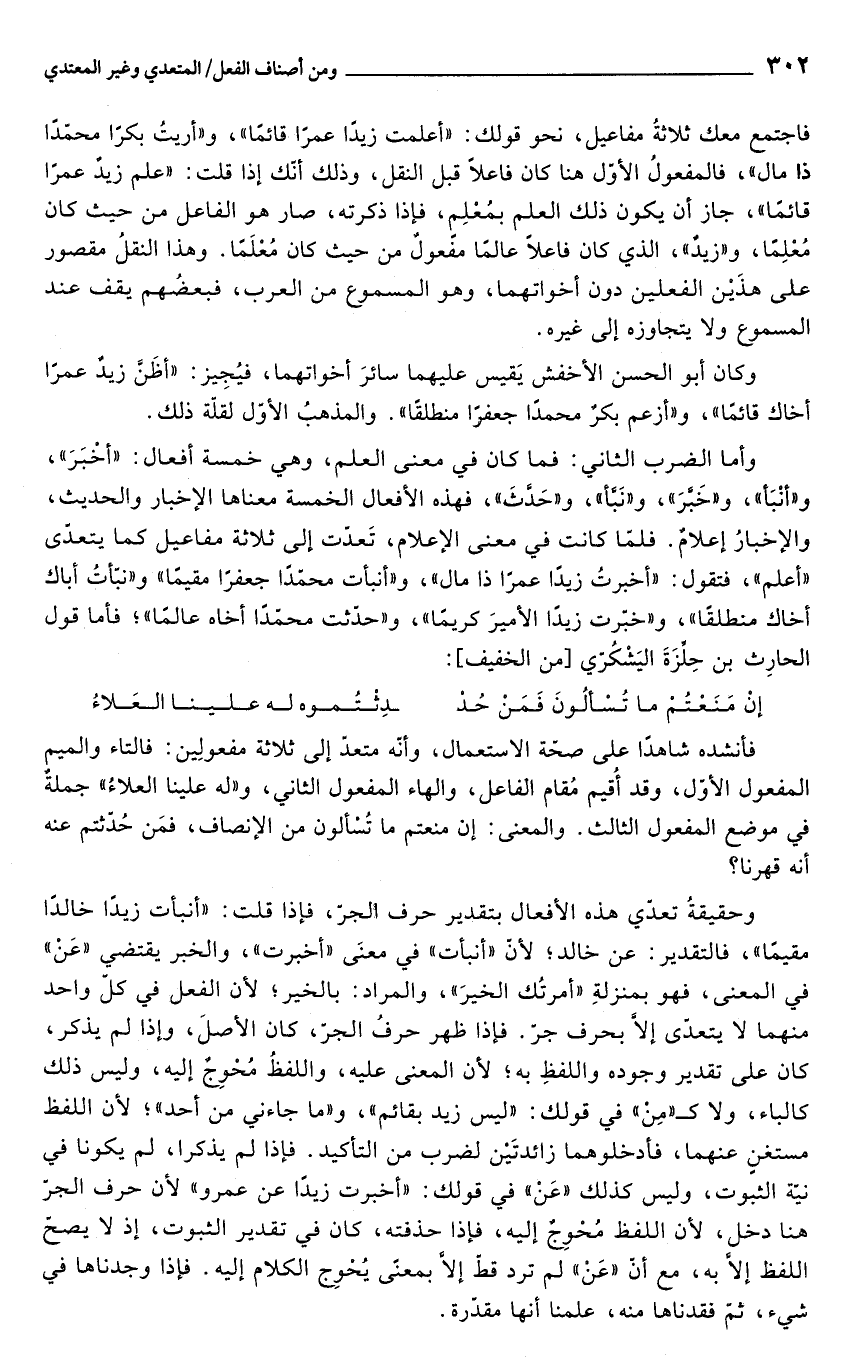وحقيقةُ تعدي هذه الأفعال بتقدير حرف الجرّ، فإذا قلت: "أنبأت زيدًا خالدًا مقيمًا"، فالتقدير: عن خالد؛ لأنّ "أنبأت" في معنَى "أخبرت"، والخبر يقتضي "عَن" في المعنى، فهو بمنزلةِ "أمرتُك الخيرَ"، والمراد: بالخير؛ لأنّ الفعل في كل واحد منهما لا يتعدّي إلّا بحرف جرّ. فإذا ظهر حرفُ الجرّ، كان الأصلَ، وإذا لم يذكر، كان على تقدير وجوده واللفظِ به؛ لأنّ المعنى عليه، واللفظ مُحْوجٌ إليه، وليس ذلك كالباء، ولا كـ"مِنْ" في قولك: "ليس زيد بقائم"، و"ما جاءني من أحد"؛ لأنّ اللفظ مستغنٍ عنهما، فأدخلوهما زائدتَين لضرب من التأكيد. فإذا لم يذكرا، لم يكونا في نية الثبوت، وليس كذلك "عَنْ" في قولك: "أخبرت زيدًا عن عمرو" لأنّ حرف الجرّ هنا دخل, لأنّ اللفظ مُحْوِجٌ إليه، فإذا حذفته، كان في تقدير الثبوت، إذ لا يصح اللفظ إلّا به، مع أن "عَنْ" لم ترد قط إلّا بمعنَى يحوِج الكلام إليه. فإذا وجدناها في شيء، ثم فقدناها منه، علمنا أنها مقدّرة.