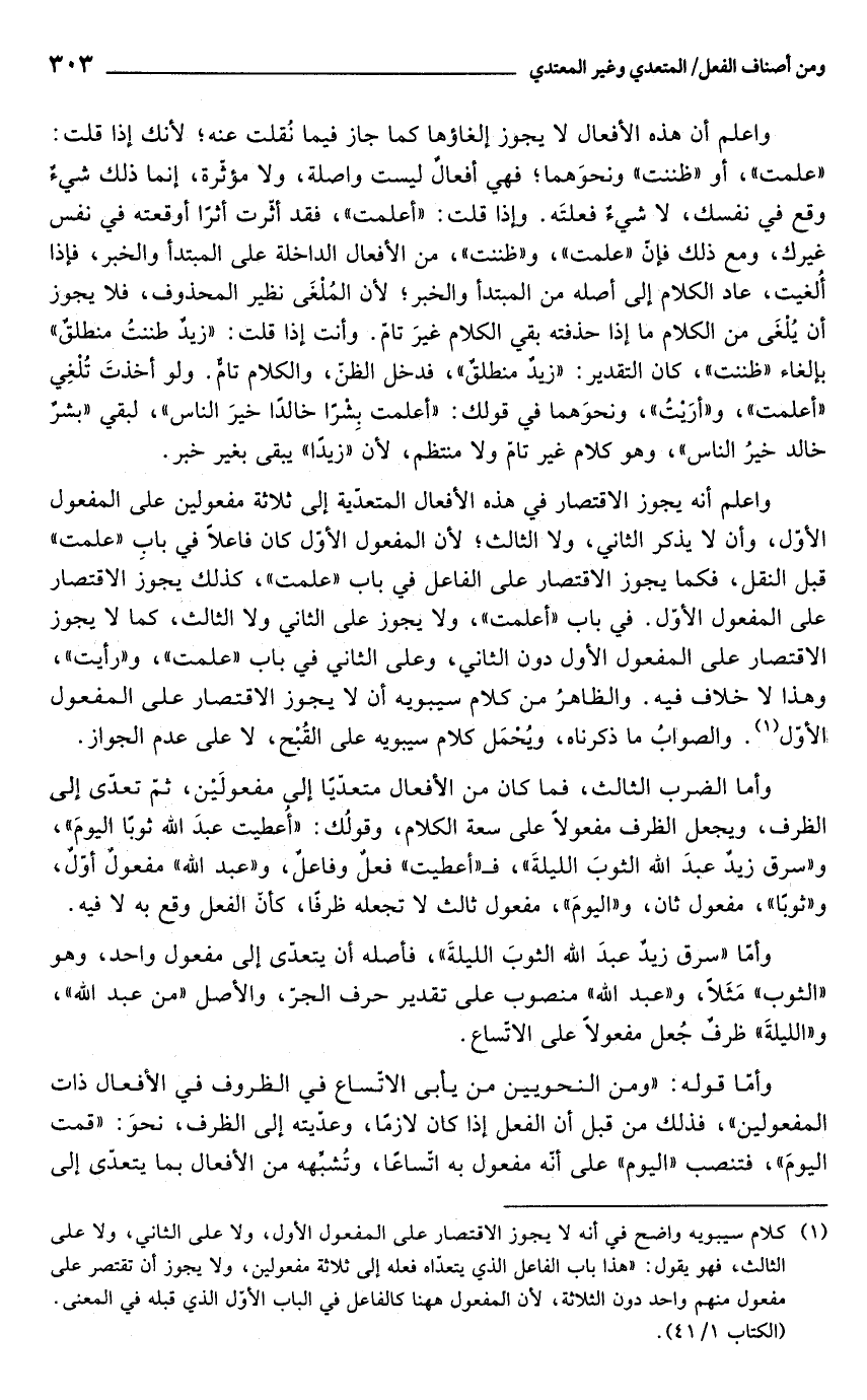 (¬1) كلام سيبويه واضح في أنه لا يجوز الاقتصار على المفعول الأول، ولا على الثاني، ولا على الثالث، فهو يقول: "هذا باب الفاعل الذي يتعداه فعله إلى ثلاثة مفعولين، ولا يجوز أن تقتصر على مفعول منهم واحد دون الثلاثة؛ لأنّ المفعول ها هنا كالفاعل في الباب الأول الذي قبله في المعنى. (الكتاب 1/ 41).