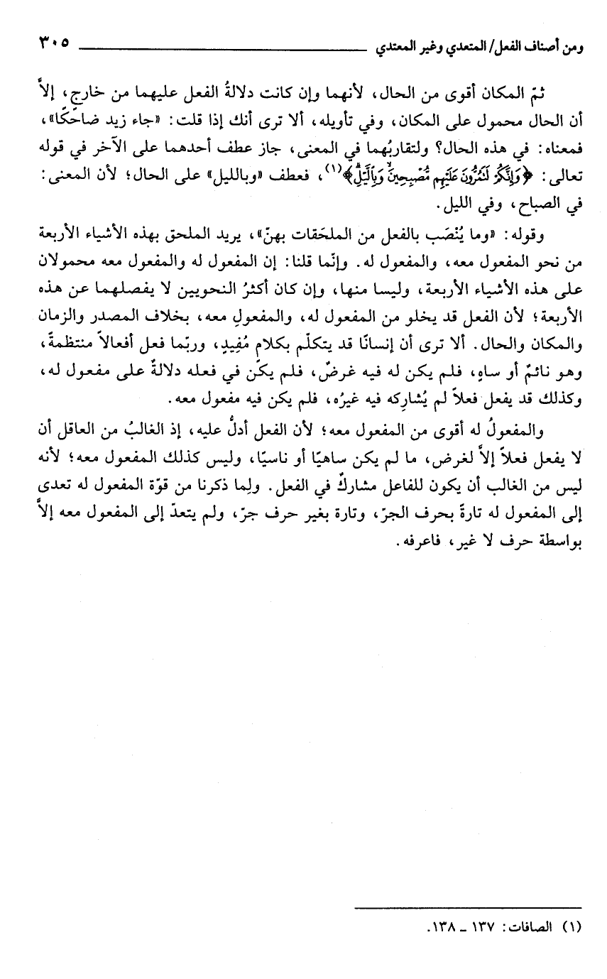 ثم المكان أقوى من الحال، لأنهما وإن كانت دلالةُ الفعل عليهما من خارج، إلّا أن الحال محمول على المكان، وفي تأويله، ألا ترى أنك إذا قلت: "جاء زيد ضاحكًا"، فمعناه: في هذه الحال؟ ولتقاربهما في المعنى، جاز عطف أحدهما على الآخر في قوله تعالى: {وَإِنَّكُمْ لَتَمُرُّونَ عَلَيْهِمْ مُصْبِحِينَ وَبِاللَّيْلِ} (¬1)، فعطف "وبالليل" على الحال؛ لأنّ المعنى: في الصباح، وفي الليل.